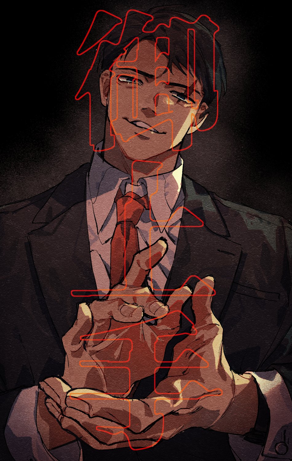 1boy bags_under_eyes black_background black_jacket clapping collared_shirt fingernails gegege_no_kitarou grin highres jacket kitarou_tanjou:_gegege_no_nazo large_hands long_sleeves looking_at_viewer male_focus mizuki_(gegege_no_kitarou) necktie nive_(dn) red_necktie scar scar_across_eye scar_on_face shirt short_hair smile solo translation_request white_shirt