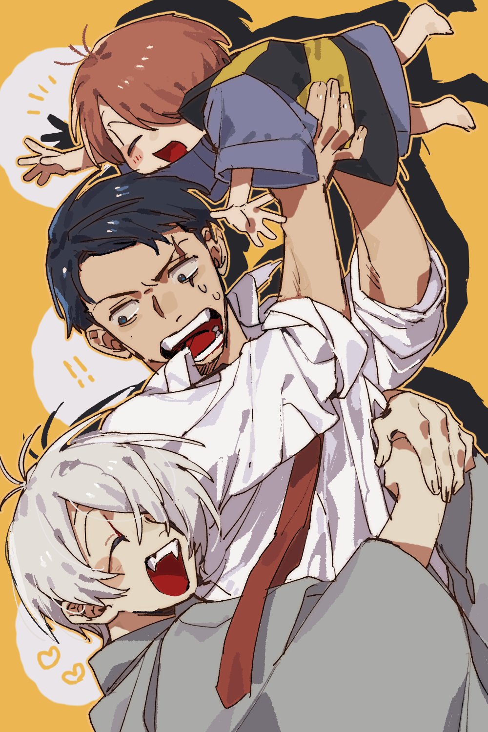 3boys black_hair brown_hair carrying_overhead closed_eyes drop_shadow gegege_no_kitarou grey_hair hair_over_one_eye highres hug japanese_clothes kitarou kitarou_tanjou:_gegege_no_nazo looking_at_another male_focus medama_oyaji medama_oyaji_(human) mizuki_(gegege_no_kitarou) multiple_boys necktie nive_(dn) open_mouth red_necktie scar scar_across_eye scar_on_face shirt striped_clothes striped_vest sweatdrop teeth upper_teeth_only vest white_shirt
