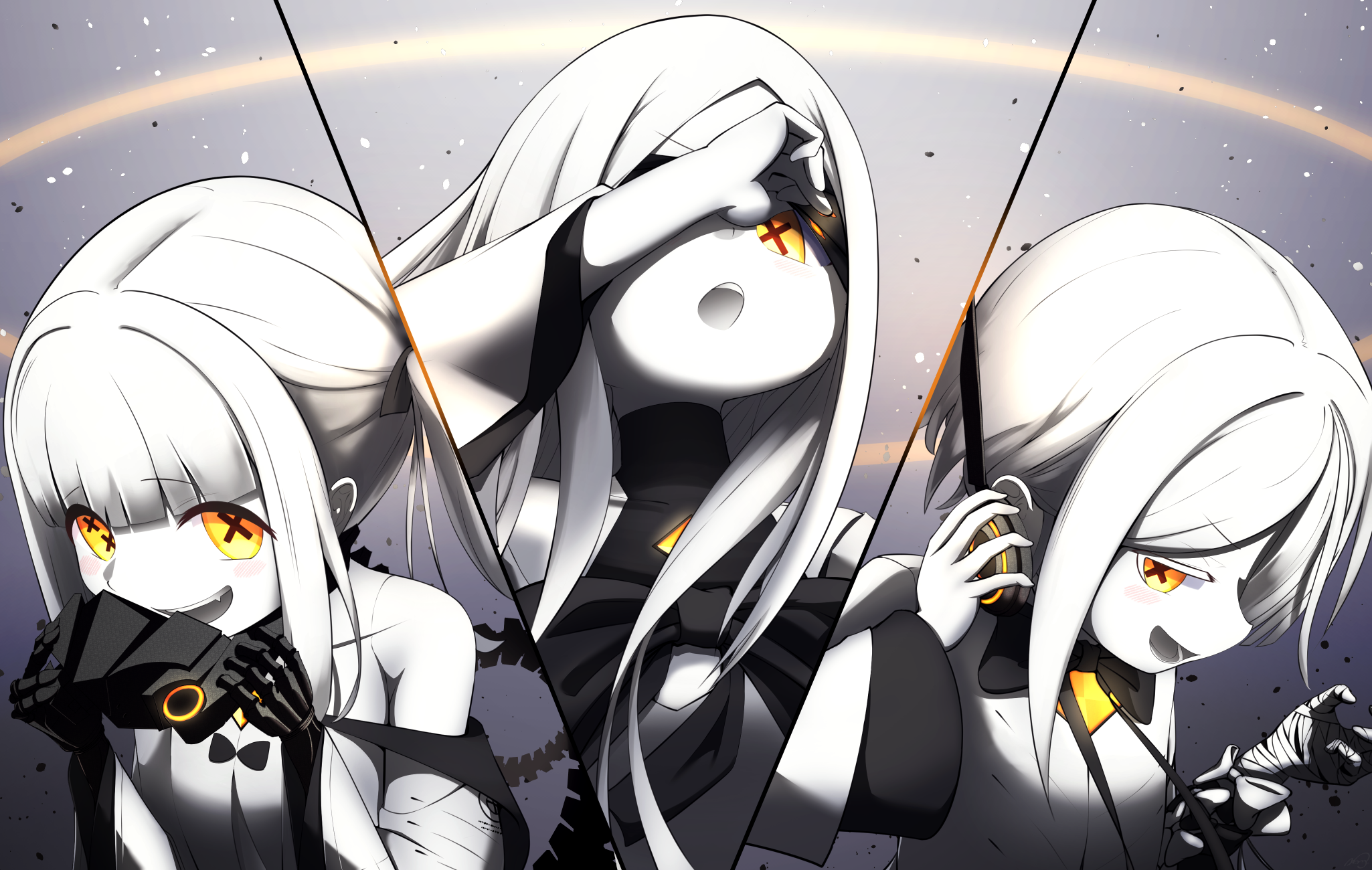 3girls bandaged_arm bandages black_mask blindfold blue_archive blush coat dress ein_(blue_archive) extra_pupils hair_over_one_eye highres long_hair mask mechanical_hands medium_hair multiple_girls ohr_(blue_archive) open_mouth respirator short_hair smile sof_(blue_archive) symbol-shaped_pupils white_coat white_dress white_hair white_muffler x-shaped_pupils yellow_eyes