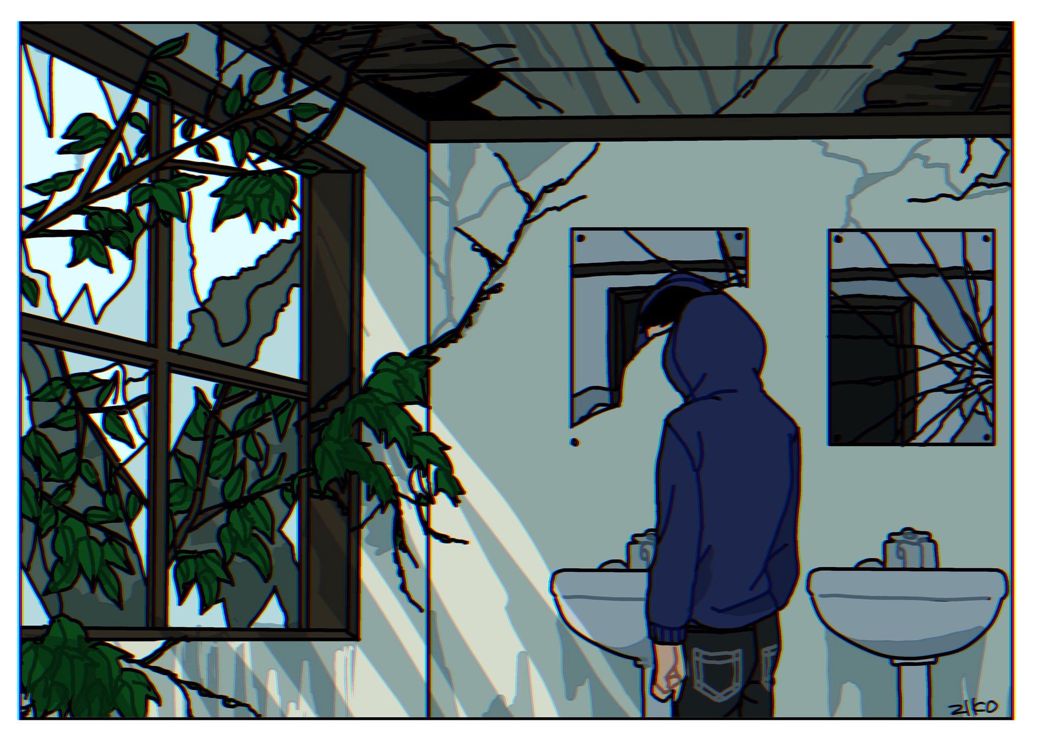 1boy abandoned arms_at_sides artist_name bathroom black_hair black_pants blue_hoodie border branch broken_mirror broken_window chromatic_aberration commentary cowboy_shot denim facing_away from_behind highres hood hood_up hoodie indoors jeans long_sleeves male_focus mirror napoli_no_otokotachi overgrown pants plant reflection shu3_(napoli_no_otokotachi) solo standing untranslatable_commentary white_border ziko_(muzikomax)