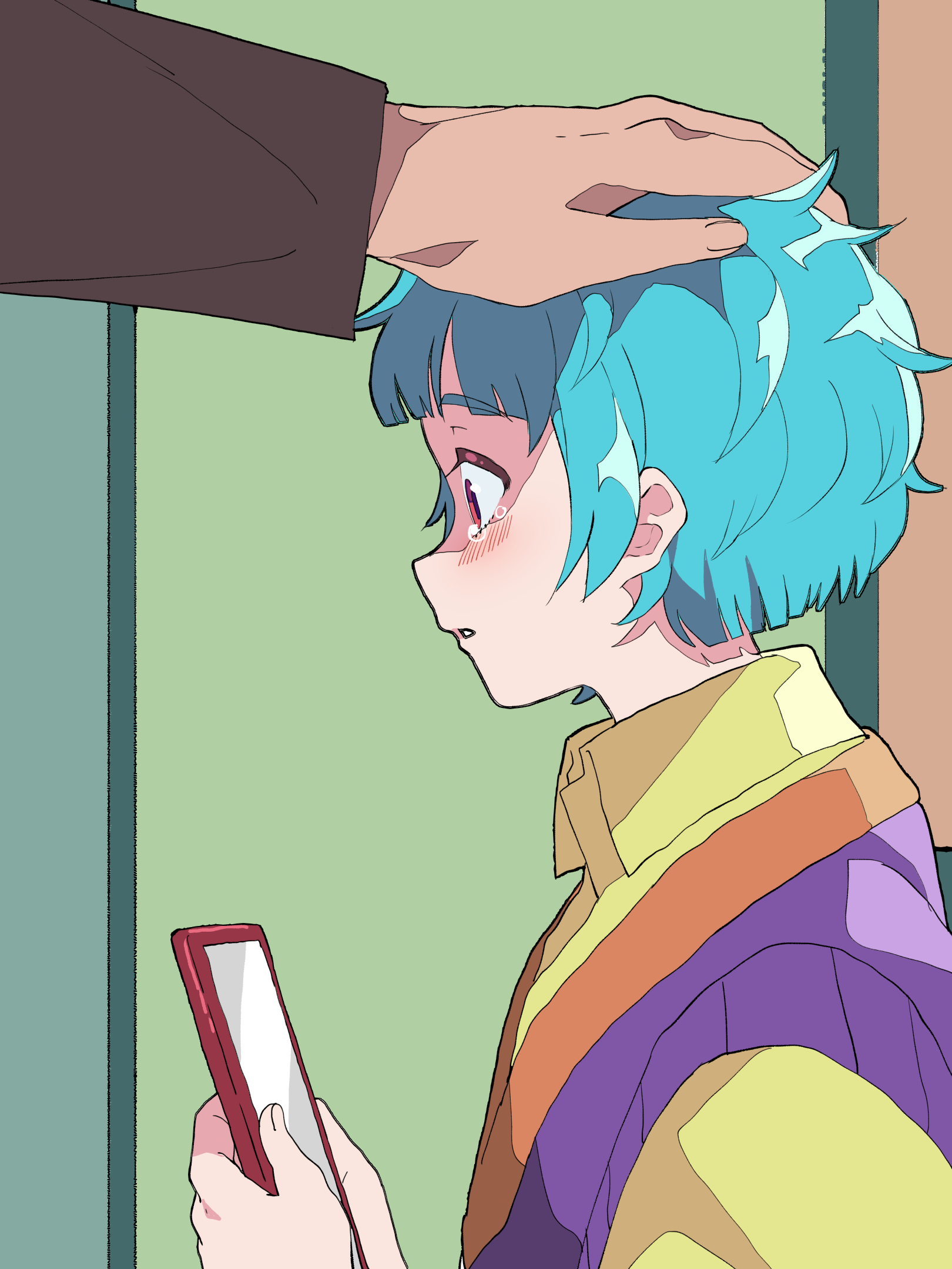 1boy 1girl blue_hair blunt_bangs collared_shirt commentary_request father_and_child father_and_daughter from_side green_background headpat highres holding holding_tablet_pc messy_hair omega_achihiko omega_auru out_of_frame parent_and_child pink_eyes pretty_series profile purple_vest shirt short_hair solo_focus tablet_pc tearing_up tsujii_luki upper_body vest waccha_primagi! yellow_shirt