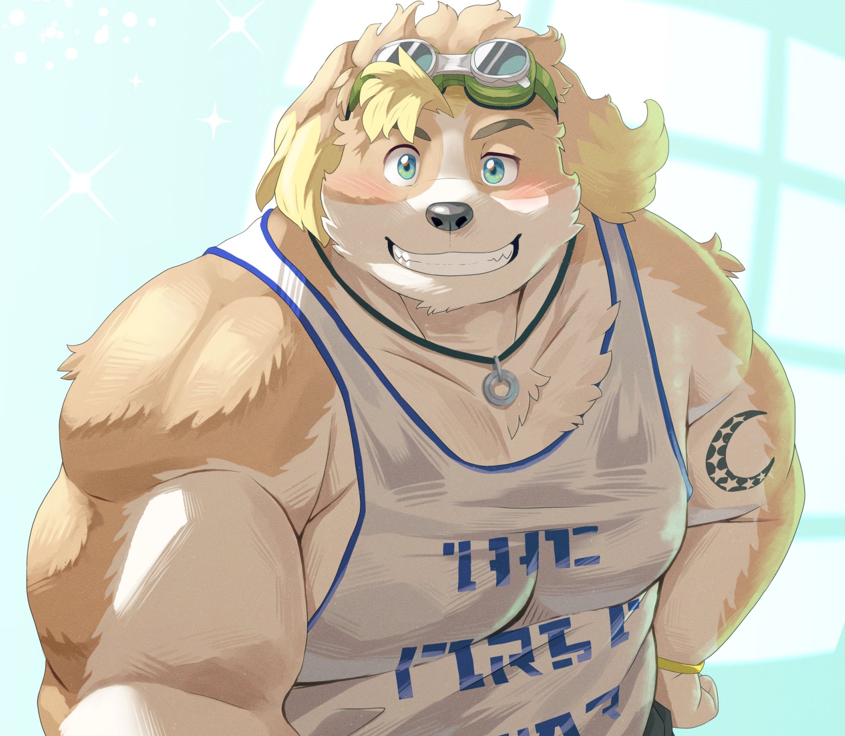 1boy animal_ears arm_tattoo bara blush commentary_request crescent_tattoo dog_boy dog_ears furry furry_male fute_(mti777) goggles goggles_on_head half-closed_eye hand_on_own_hip highres hisaki_(live_a_hero) jewelry live_a_hero looking_at_viewer male_focus necklace smile sparkle tank_top tattoo white_tank_top