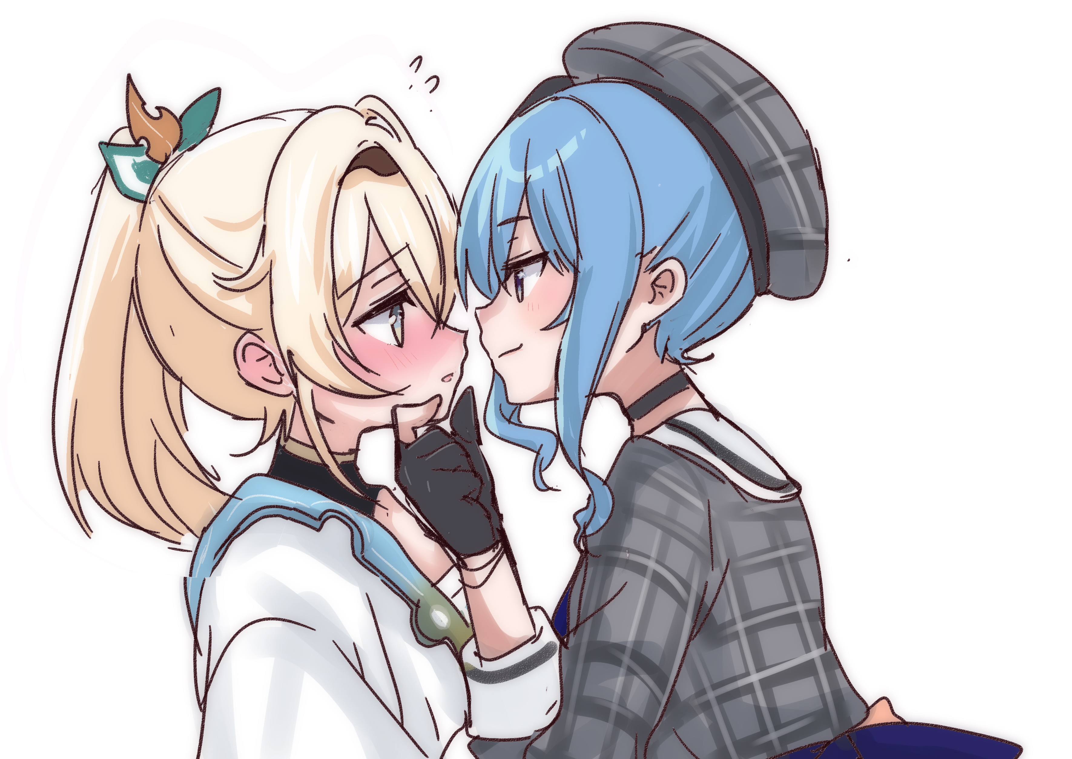 2girls absurdres beret black_choker black_gloves blonde_hair blue_eyes blue_hair blush bracelet chest_sarashi choker flustered gloves grey_headwear grey_jacket hair_ornament hand_on_another's_chin haori hat headband highres hololive hoshimachi_suisei hoshimachi_suisei_(1st_costume) imminent_kiss jacket japanese_clothes jewelry kazama_iroha kazama_iroha_(1st_costume) leaf_hair_ornament light_smile long_hair multiple_girls partially_fingerless_gloves roboro935672 sarashi side_ponytail smile smug staring virtual_youtuber yuri