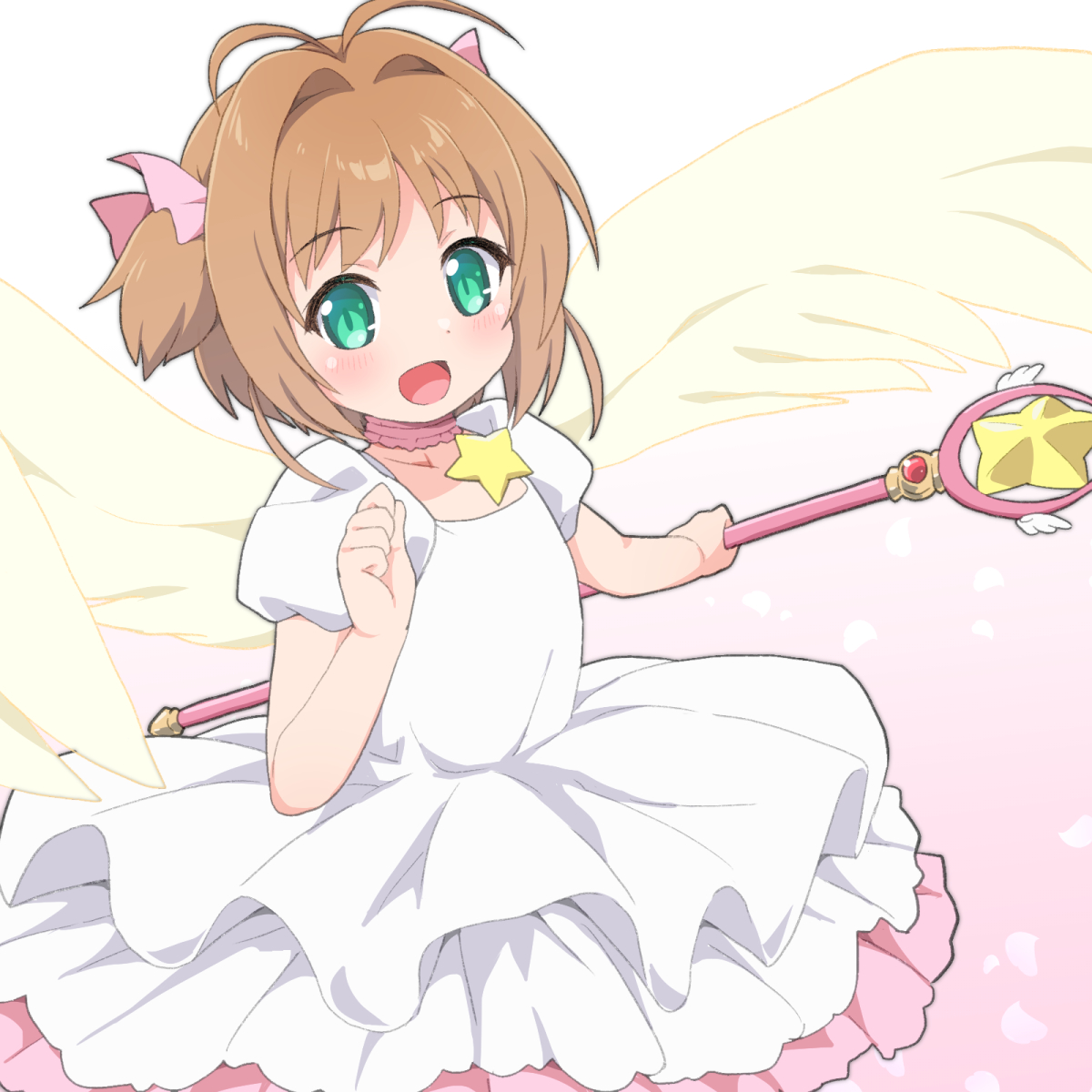 1girl cardcaptor_sakura dress flat_chest green_eyes hair_ribbon highres holding holding_weapon kinomoto_sakura kinomoto_sakura_(astral_sakura) light_brown_hair petals pink_background pink_ribbon puffy_dress puffy_short_sleeves puffy_sleeves ribbon rose_petals shirogane_hakuba short_hair short_sleeves short_twintails solo star_(symbol) twintails weapon white_dress