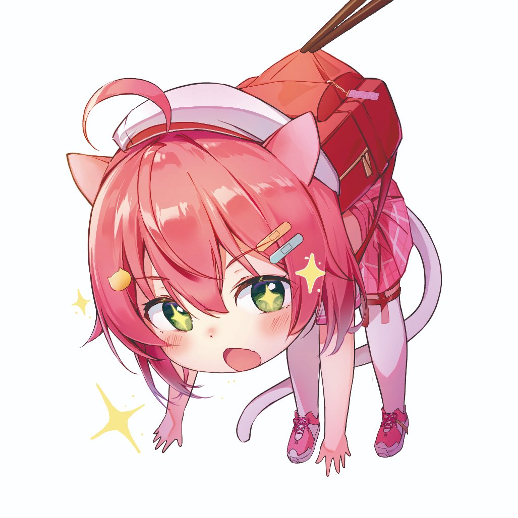 +_+ 1girl ahoge backpack bag bandaid bandaid_hair_ornament beret blush cat_hair_ornament chibi chopsticks double-parted_bangs green_eyes hair_ornament hairclip hat hololive looking_at_viewer miniskirt official_alternate_costume official_alternate_hairstyle open_mouth pink_hair pink_shoes pink_skirt plaid_clothes plaid_skirt pleated_skirt randoseru red_bag sakura_miko sakura_miko_(school_uniform) school_uniform shirt shoes short_hair short_sleeves skirt sneakers solo syafa thigh_strap thighhighs virtual_youtuber white_hat white_shirt white_thighhighs