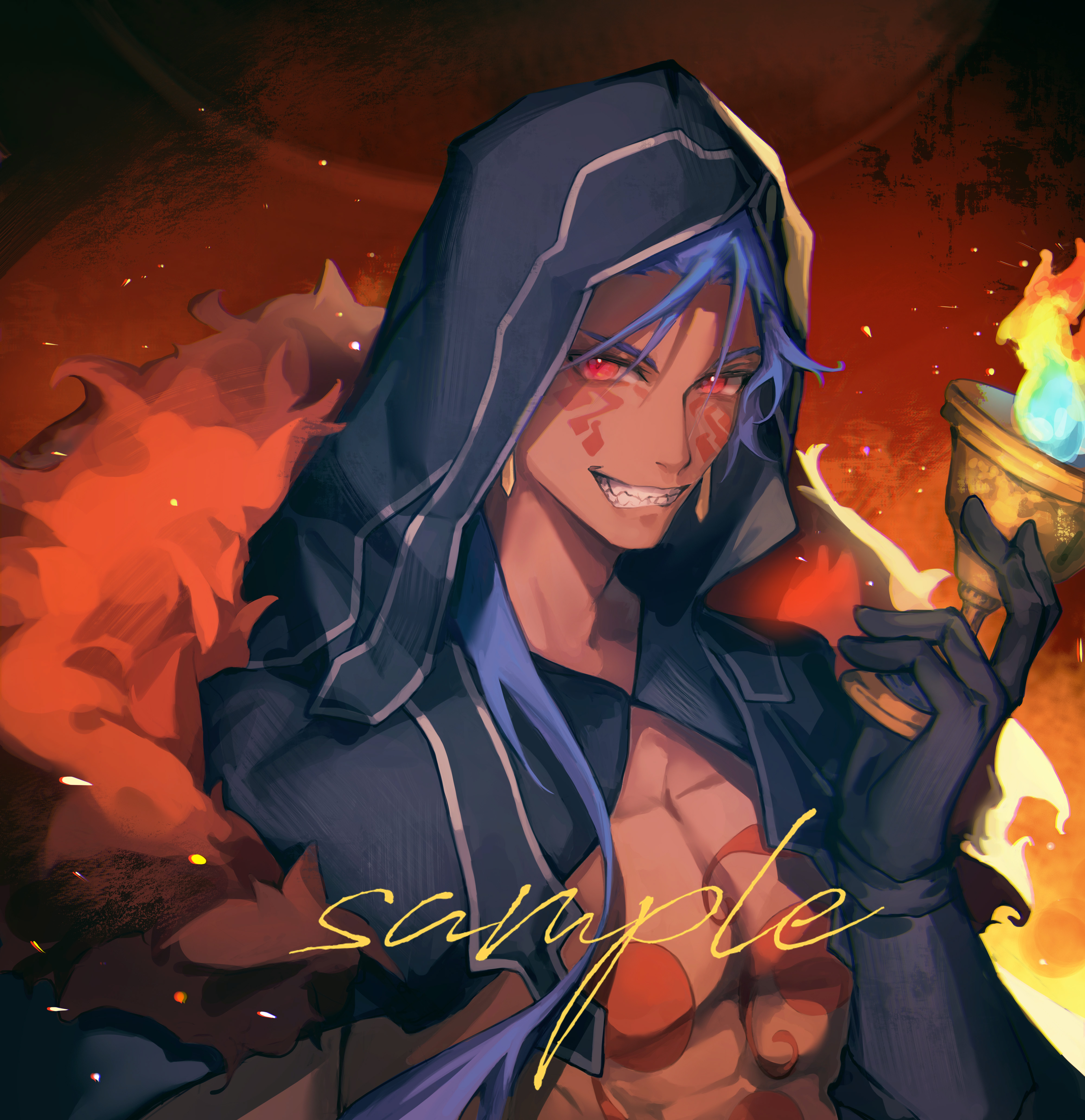 1boy absurdres asa_achen black_gloves blue_hair chaldean_visionary_flames chest_tattoo cu_chulainn_(fate) cu_chulainn_alter_(fate) detached_hood earrings facial_mark fate/grand_order fate_(series) fire gloves grin hair_over_shoulder highres holding jewelry chaldean_visionary_flames long_hair looking_at_viewer male_focus mature_male muscular muscular_male red_eyes sample_watermark smile solo tattoo teeth topless_male upper_body watermark