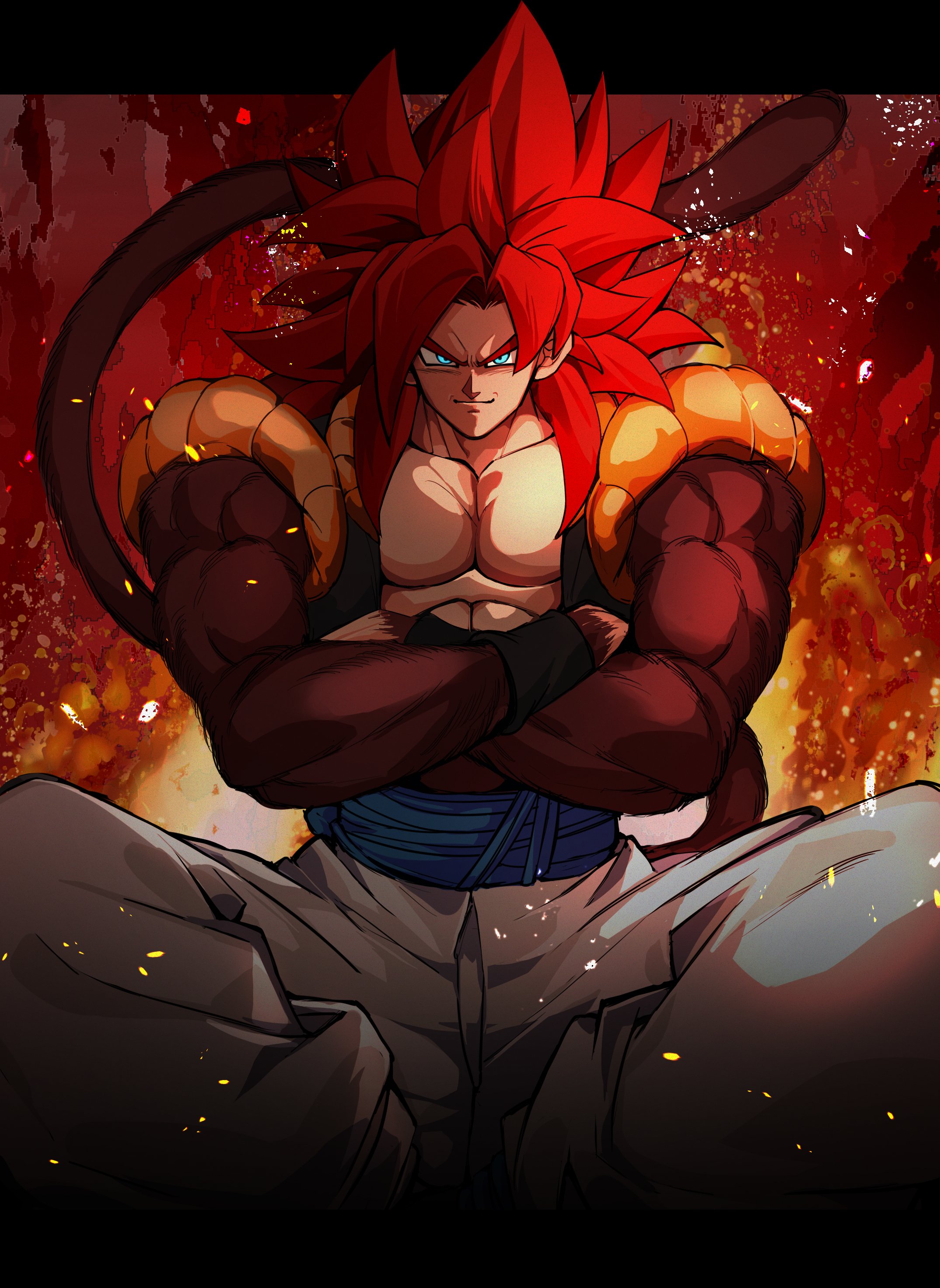 1boy absurdres biceps blue_sash body_fur dragon_ball dragon_ball_gt gigatan_d gogeta highres long_hair looking_at_viewer male_focus metamoran_vest monkey_boy monkey_tail muscular muscular_male no_nipples pants pectorals saiyan sash solo spiked_hair super_saiyan super_saiyan_4 tail