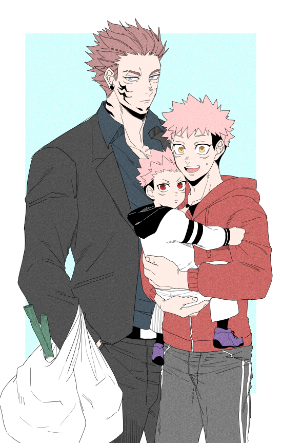 3boys aged_down bag blue_background carrying child closed_mouth collared_shirt commentary_request facial_mark holding holding_bag hood hood_down hoodie itadori_yuji jujutsu_kaisen long_sleeves looking_at_viewer male_focus multiple_boys multiple_persona open_mouth pink_hair red_eyes red_hoodie ryoumen_sukuna_(jujutsu_kaisen) shirt shopping_bag short_hair simple_background smile standing wakame_shi yellow_eyes