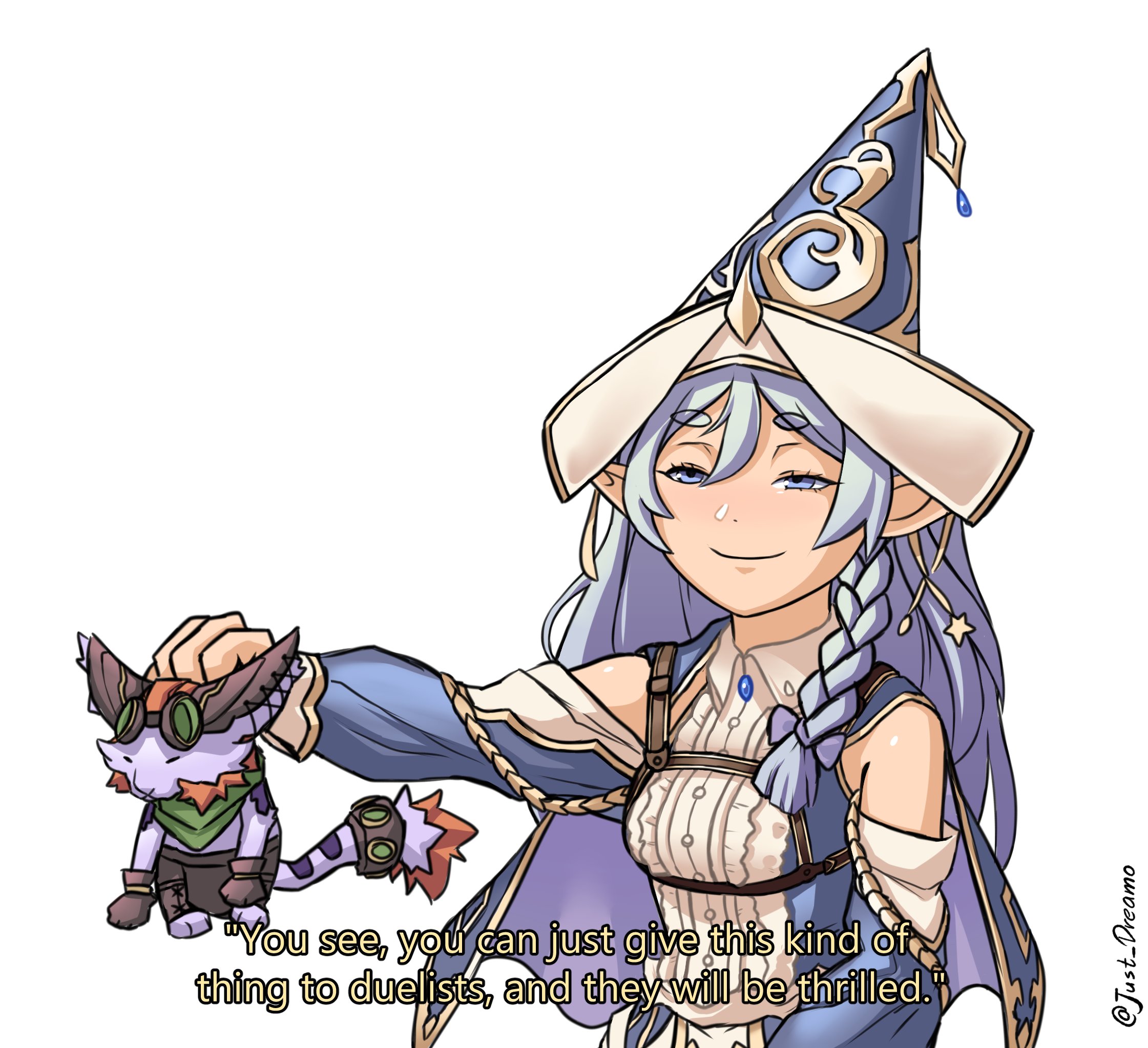 1girl 1other bare_shoulders blue_dress blue_eyes blue_hair braid cat dress duel_monster elf english_text fake_subtitles hat head_grab highres just_dreamo looking_at_viewer meme parody pointy_ears side_braid simple_background smug sousou_no_frieren wandering_gryphon_rider water_enchantress_of_the_temple white_background witch_hat you_can_just_give_this_kind_of_thing_to_men_and_they_will_be_thrilled_(meme) yu-gi-oh!