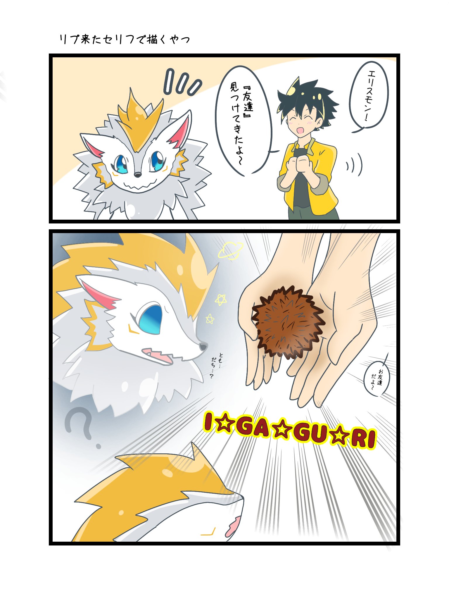 blonde_hair blue_eyes closed_eyes digimon digimon_(creature) digimon_rearise herissmon highres japanese_text looking_at_another male_protagonist_(digimon_rearise) open_mouth sharp_teeth teeth translation_request