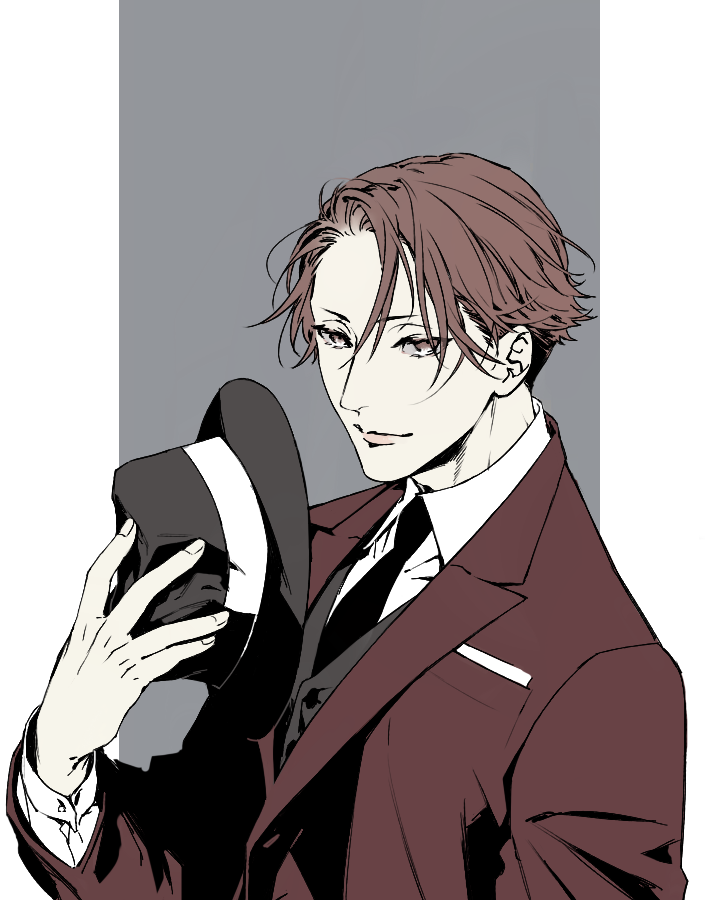 1boy black_hat black_necktie black_vest brown_eyes brown_hair brown_jacket closed_mouth collared_shirt fingernails grey_background hand_up hat holding holding_unworn_clothes holding_unworn_hat jacket joker_game lapels light_smile long_sleeves looking_at_viewer male_focus messy_hair miyoshi_(joker_game) necktie shi646 shirt short_hair simple_background solo swept_bangs unworn_hat unworn_headwear upper_body vest waistcoat white_background white_shirt