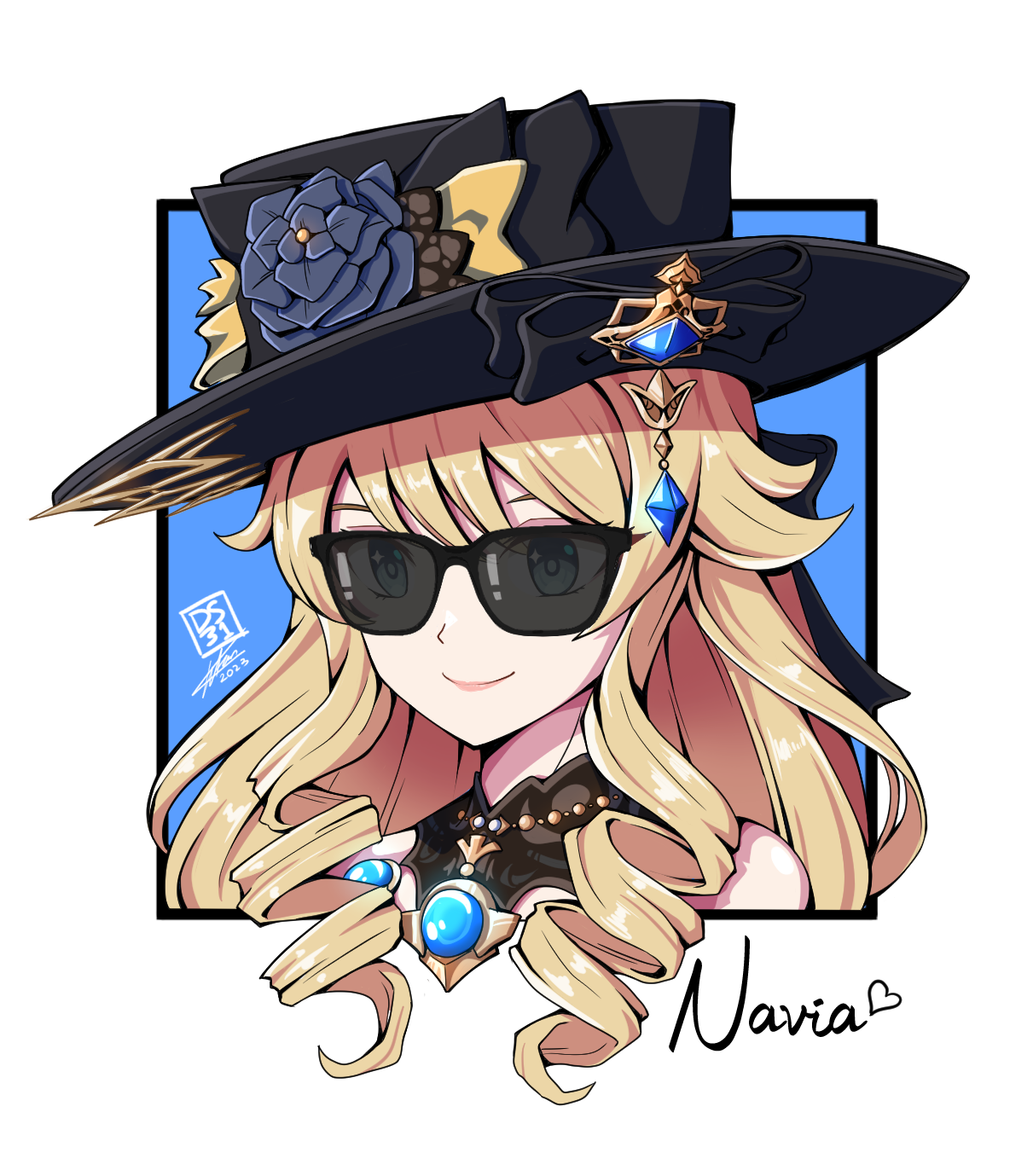 1girl black_hat blonde_hair blue_flower blue_rose character_name commentary darkstar31 drill_hair drill_sidelocks flower genshin_impact hat hat_flower highres long_hair navia_(genshin_impact) pink_lips portrait rose sidelocks smile solo sunglasses
