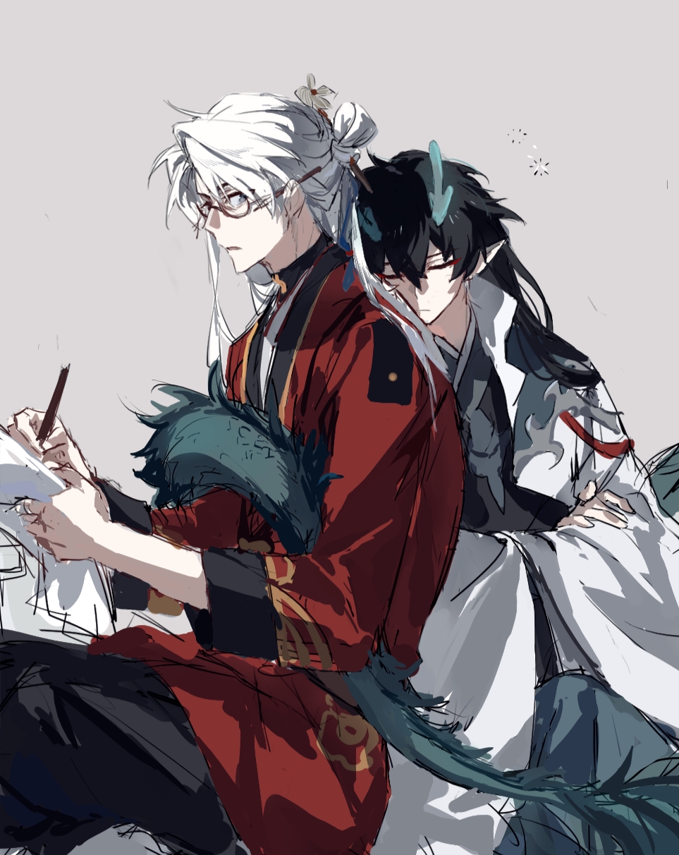 2boys aqua_horns black_hair black_pants blade_(honkai:_star_rail) brown-framed_eyewear closed_eyes closed_mouth collared_jacket crossed_arms dan_feng_(honkai:_star_rail) dan_heng_(honkai:_star_rail) dan_heng_(imbibitor_lunae)_(honkai:_star_rail) eyeliner from_side glasses green_tail grey_background grey_eyes hair_ornament hair_rings hair_stick head_on_another's_back high_collar highres holding holding_paper honkai:_star_rail honkai_(series) horns jacket japanese_clothes kimono lapels long_hair looking_at_another makeup male_focus multiple_boys pants paper parted_lips pencil_behind_ear pointy_ears ponytail profile red_eyeliner red_jacket regenerate0330 sidelocks sitting sleeping tail tail_around_another's_waist tail_around_waist tail_wrap three-quarter_sleeves white_hair white_jacket writing yingxing_(honkai:_star_rail)