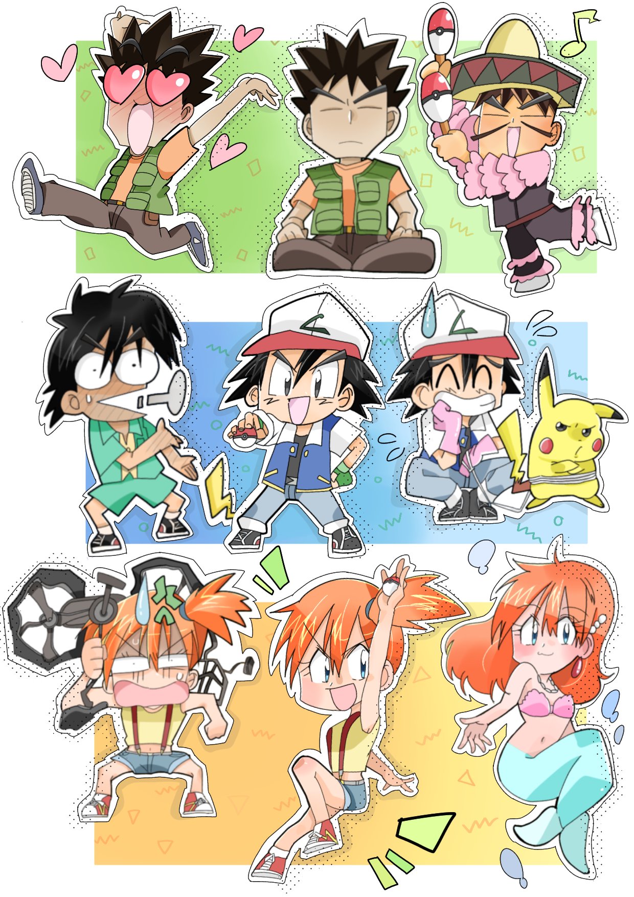 1girl 2boys ash_ketchum asymmetrical_hair bikini black_hair blush breasts brock_(pokemon) denim denim_shorts earrings gen_1_pokemon green_eyes gym_leader hair_ornament hair_tie highres jacket jewelry legs long_hair medium_breasts mermaid mermaid_costume mermaid_misty_(pokemon) misty_(pokemon) monster_girl multiple_boys navel necklace nintendo orange_hair pikachu pokemon pokemon_(anime) pokemon_(classic_anime) ponytail seashell shell shell_bikini shirt short_hair shorts side_ponytail solo suspenders swimsuit tank_top yellow_shirt