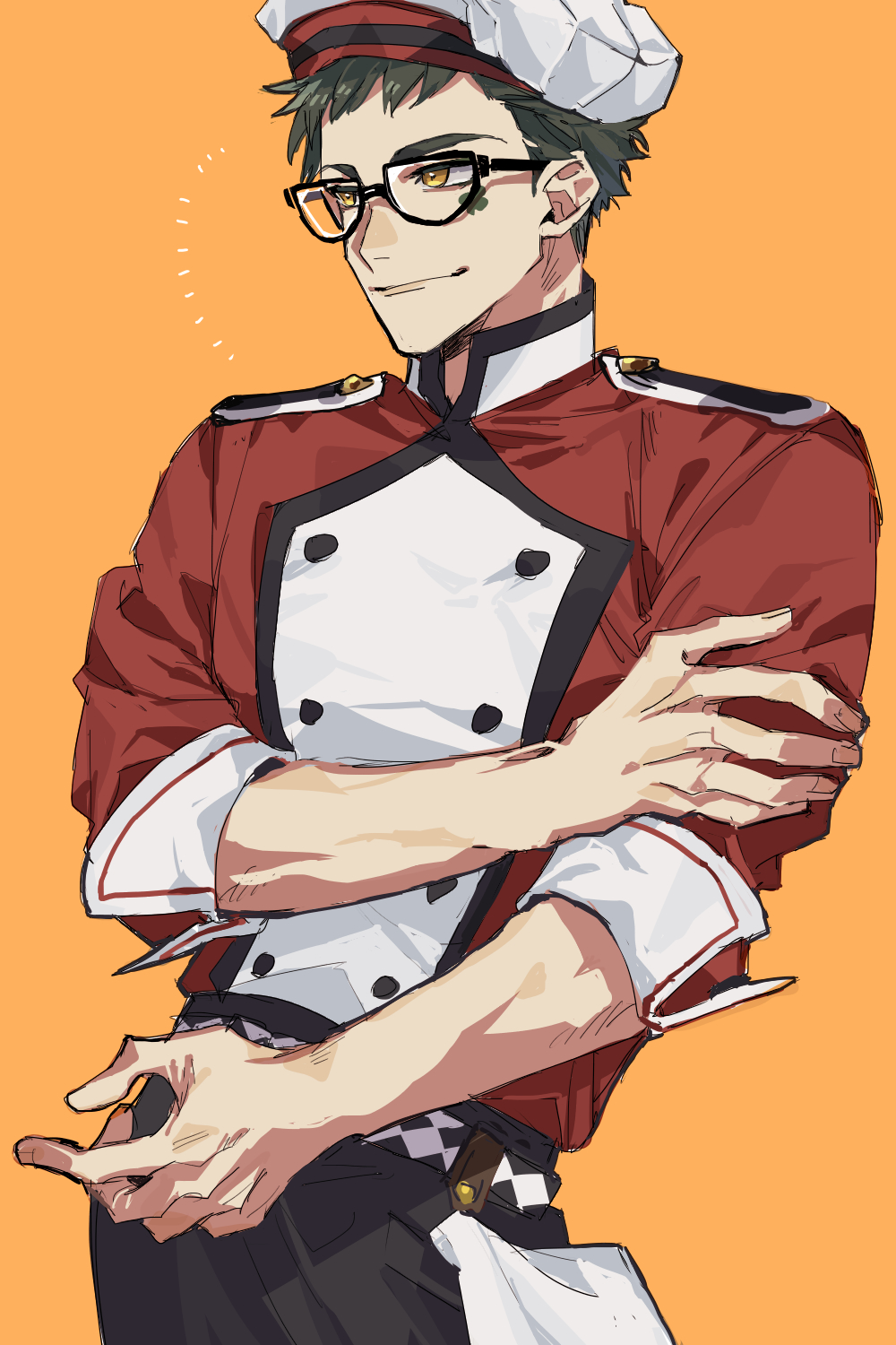 1boy belt black_pants brown_eyes closed_mouth facial_mark fingernails hand_on_own_arm highres looking_ahead male_focus nive_(dn) orange_background pants red_shirt shirt short_hair three-quarter_sleeves solo trey_clover twisted_wonderland white_belt white_headwear