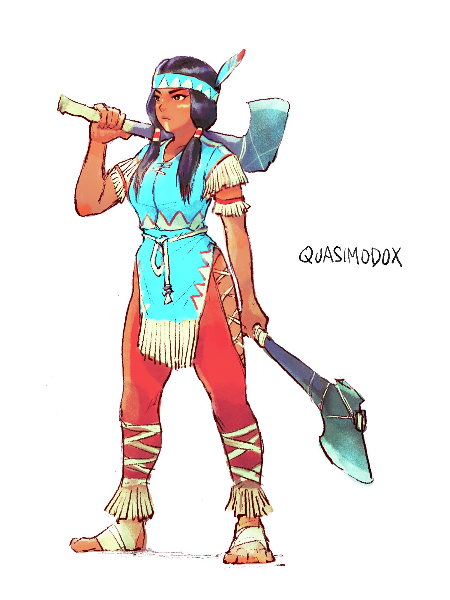 1girl axe black_hair clothing_cutout dark-skinned_female dark_skin feather_hair_ornament hair_ornament headdress highres hip_vent lily_hawk long_hair native_american_clothes native_american_headdress pants quasimodox short_sleeves street_fighter street_fighter_6 twintails white_background