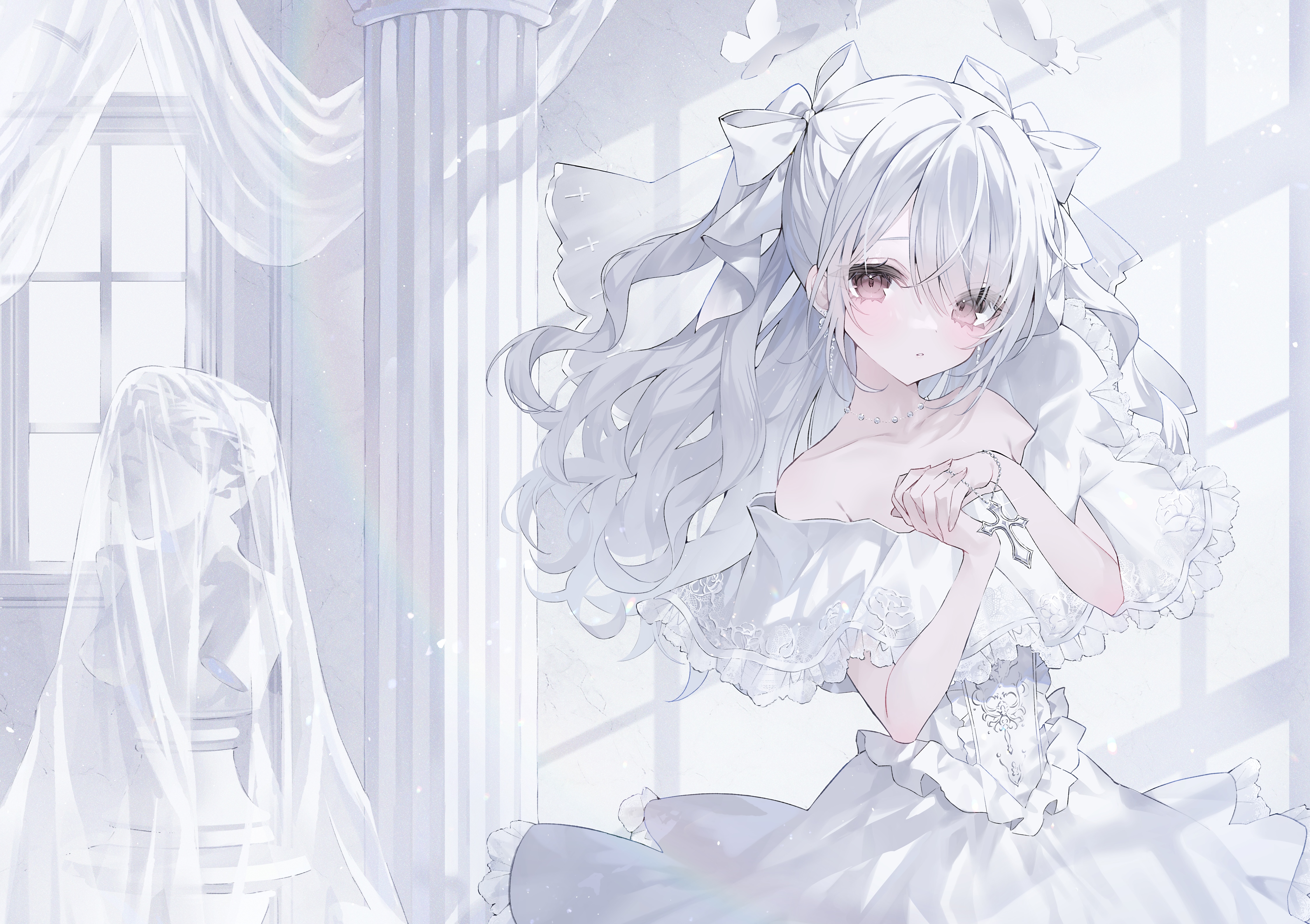 1girl absurdres bow collarbone cowboy_shot cross dress earrings frilled_dress frills hair_bow highres holding_hands indoors interlocked_fingers jewelry long_hair looking_at_viewer necklace noah_(0noah) off-shoulder_dress off_shoulder original pink_hair solo statue white_bow white_dress white_hair white_theme window_shadow