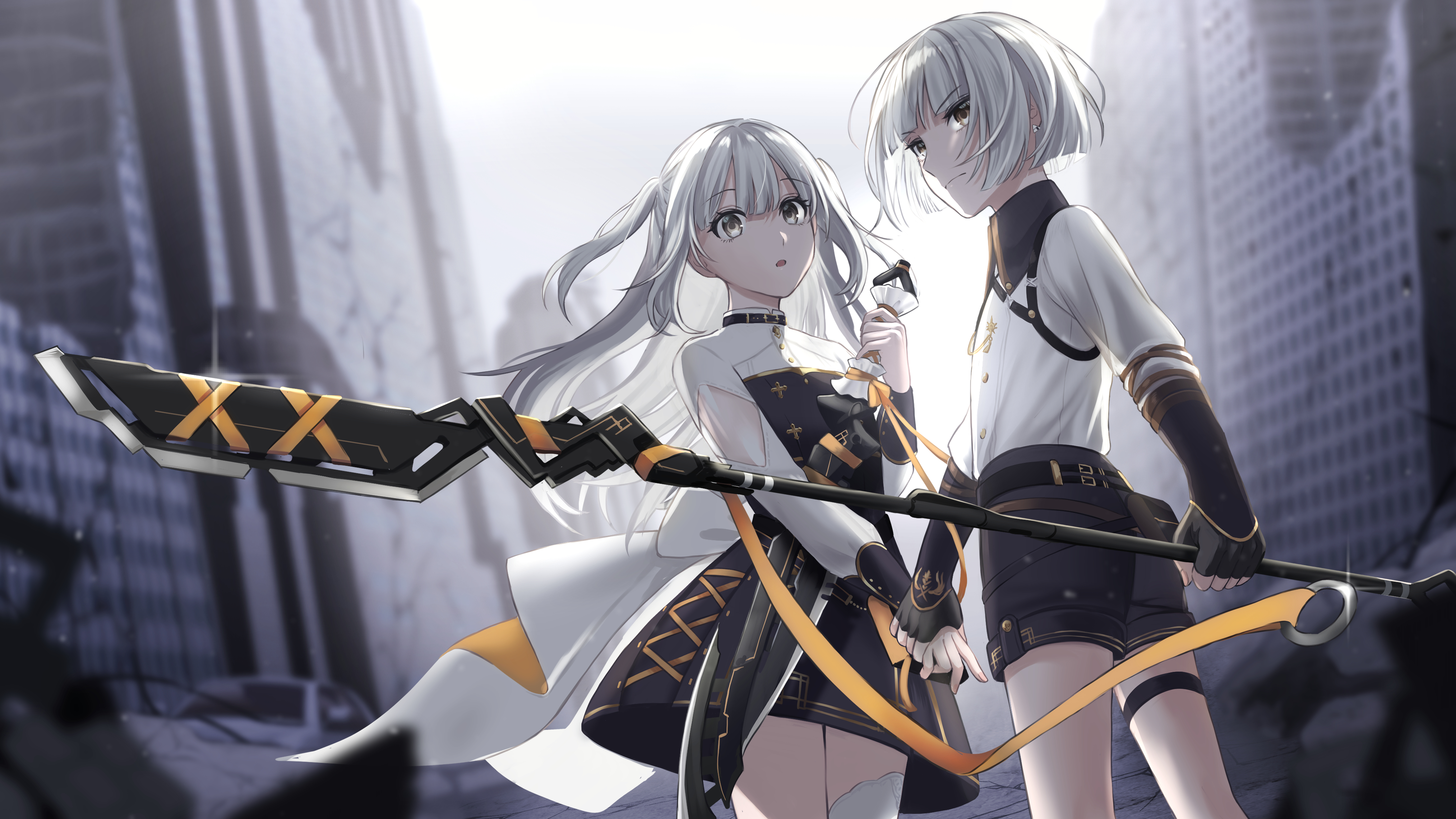 2girls absurdres belt city collared_shirt fingerless_gloves glint gloves grey_eyes highres holding holding_hands holding_sword holding_weapon long_hair long_sleeves looking_at_viewer looking_back multiple_girls nil_(pixiv_53614557) open_mouth outdoors ronguteru_(towa_tsugai) ruins shirt short_hair shorts single_thighhigh skirt suzume_(towa_tsugai) sword thigh_strap thighhighs towa_tsugai two_side_up very_long_hair weapon white_hair