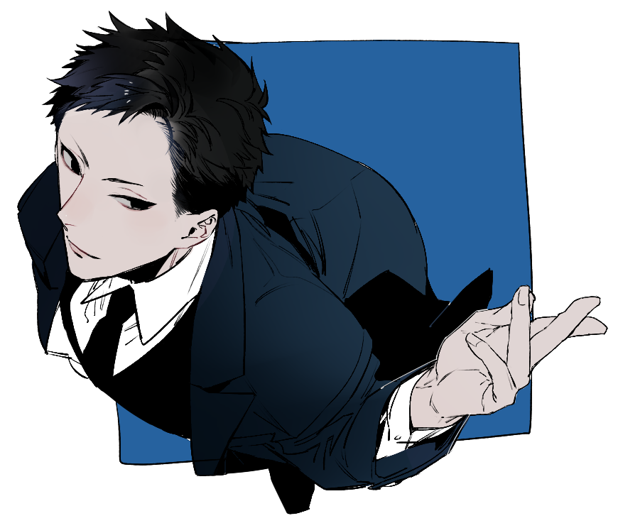 1boy arm_up black_eyes black_hair black_necktie black_vest blue_background border closed_mouth collared_shirt expressionless fingernails from_above grey_jacket jacket joker_game lapels long_sleeves looking_to_the_side male_focus necktie open_clothes open_jacket outside_border shi646 shirt short_hair sideways_glance simple_background solo tazaki_(joker_game) vest waistcoat white_border white_shirt