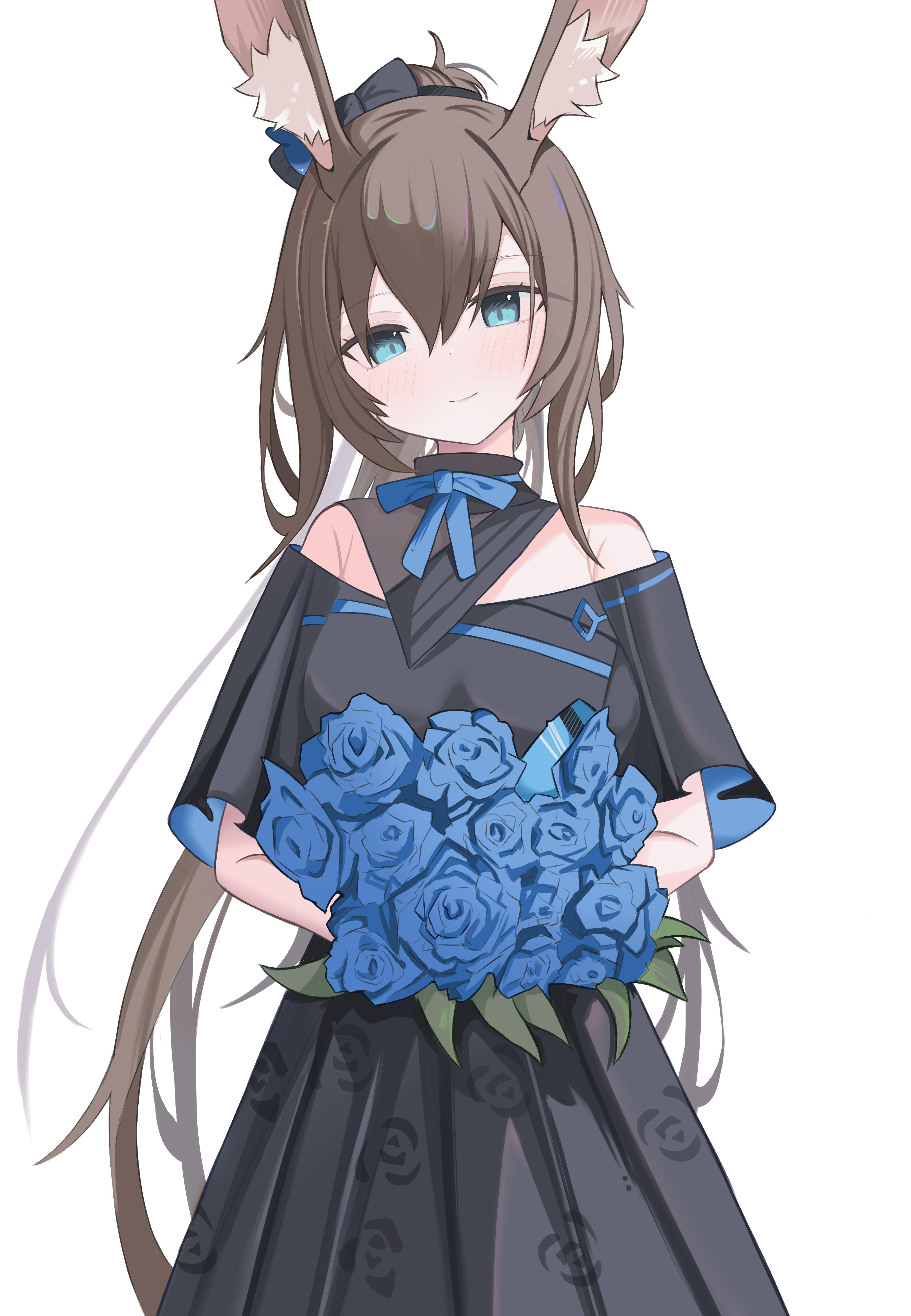 1girl absurdres amiya_(arknights) animal_ear_fluff animal_ears arknights black_bow black_dress blue_eyes blue_flower blue_ribbon bouquet bow breasts brown_hair commentary_request cowboy_shot dress flower hair_between_eyes hair_bow head_tilt highres holding holding_bouquet holding_flower long_hair looking_at_viewer neck_ribbon nui_(nuinui0300) off-shoulder_dress off_shoulder partial_commentary ponytail rabbit_ears rabbit_girl ribbon simple_background small_breasts smile solo very_long_hair white_background