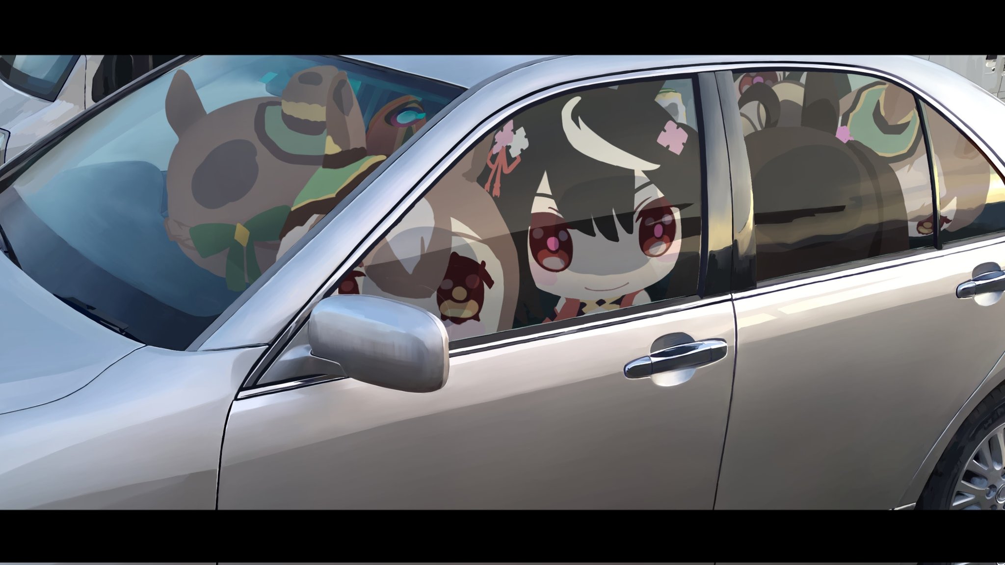 ahoge animal_ears black_hair blush_stickers bow brown_hair butterwabito car character_doll commentary_request doll doqute_stuffed_doll ear_ornament green_bow hair_between_eyes highres horse_ears horse_girl kitasan_black_(umamusume) long_hair looking_at_viewer motor_vehicle no_humans outdoors satono_diamond_(umamusume) smile stuffed_toy umamusume very_long_hair yellow_eyes