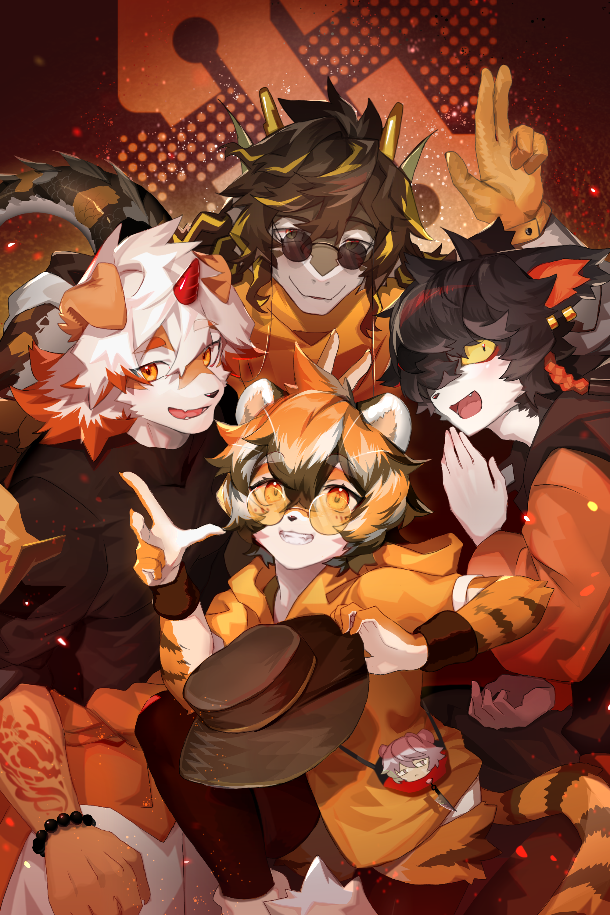1girl 4boys aak_(arknights) absurdres animal_ears arknights bear_boy black_headwear black_shirt bracelet braid chinese_commentary clothes_around_waist colored_tips commentary_request dragon_boy dragon_ears dragon_horns ear_piercing fins fish_tail furry furry_female furry_male gloves hair_over_one_eye highres horns hung_(arknights) jacket jacket_around_waist jaye_(arknights) jewelry knife lee_(arknights) looking_at_viewer multicolored_hair multiple_boys one_eye_covered orange_jacket orange_scarf piercing round_eyewear scarf shabi96522 shirt single_horn smile sunglasses tail tiger_ears tiger_stripes tiger_tail waai_fu_(arknights) yellow_gloves