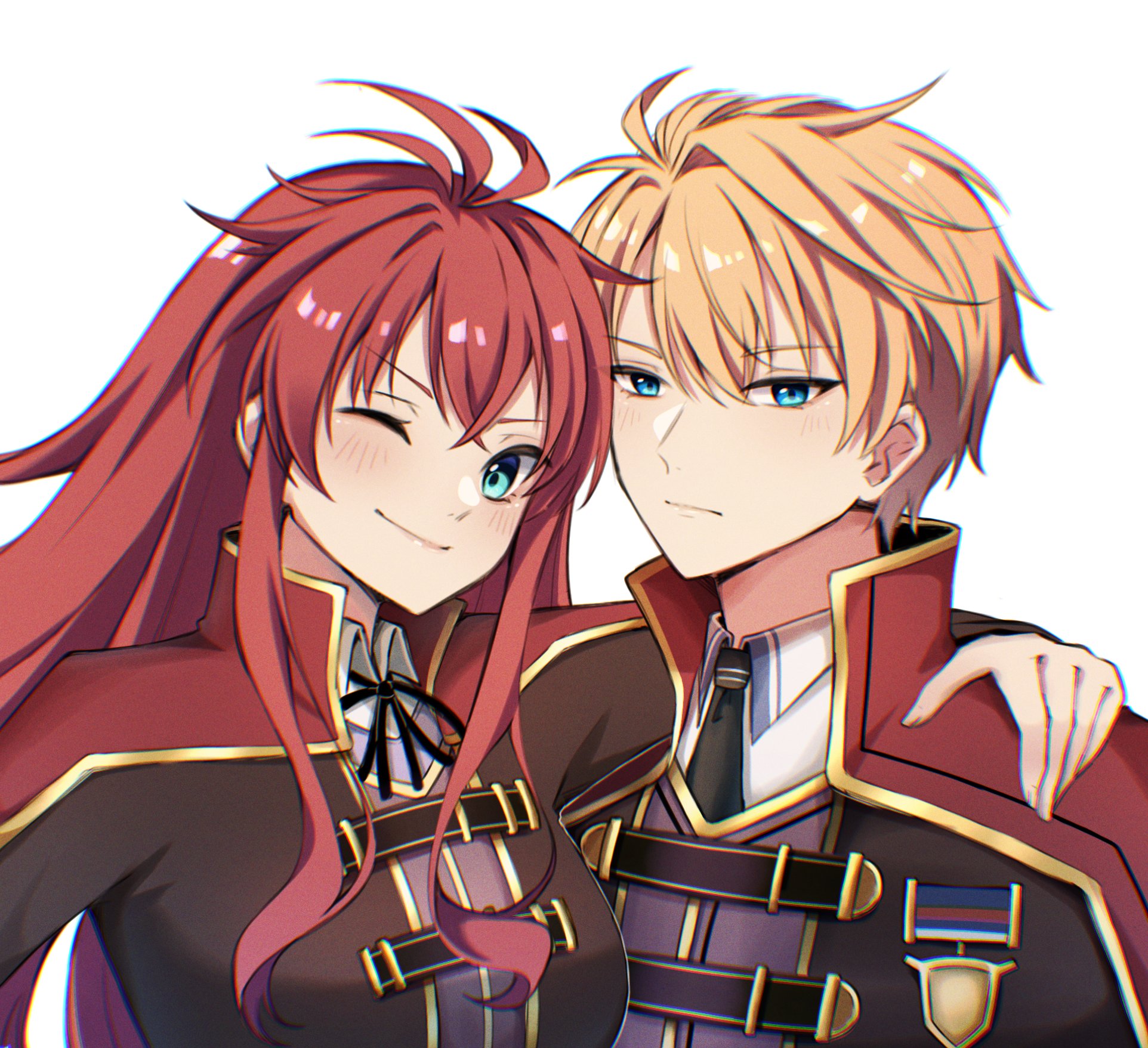 1boy 1girl altheya_nia blonde_hair blue_eyes cedric_reise_arnor chromatic_aberration closed_mouth commentary commentary_request commission crossed_bangs eiyuu_densetsu english_commentary highres long_hair mixed-language_commentary one_eye_closed red_hair second-party_source sen_no_kiseki sen_no_kiseki_(series) sen_no_kiseki_i sen_no_kiseki_iv shirley_orlando short_hair simple_background smile upper_body white_background