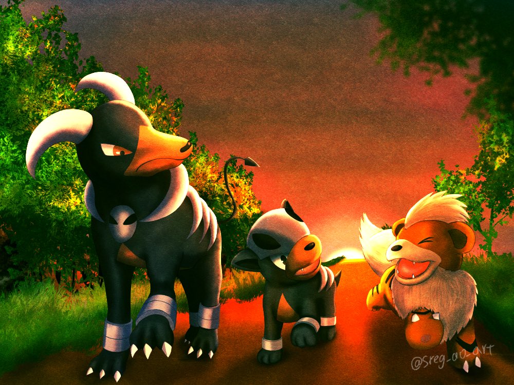 animal_focus artist_name black_skin claws closed_eyes colored_skin commentary_request dawn demon_tail dog evolutionary_line fangs gen_1_pokemon gen_2_pokemon grass growlithe horns houndoom houndour mane nintendo no_humans orange_sky pokemon pokemon_(creature) red_eyes sky snout sreg_ao_art tail tree twitter_username walking