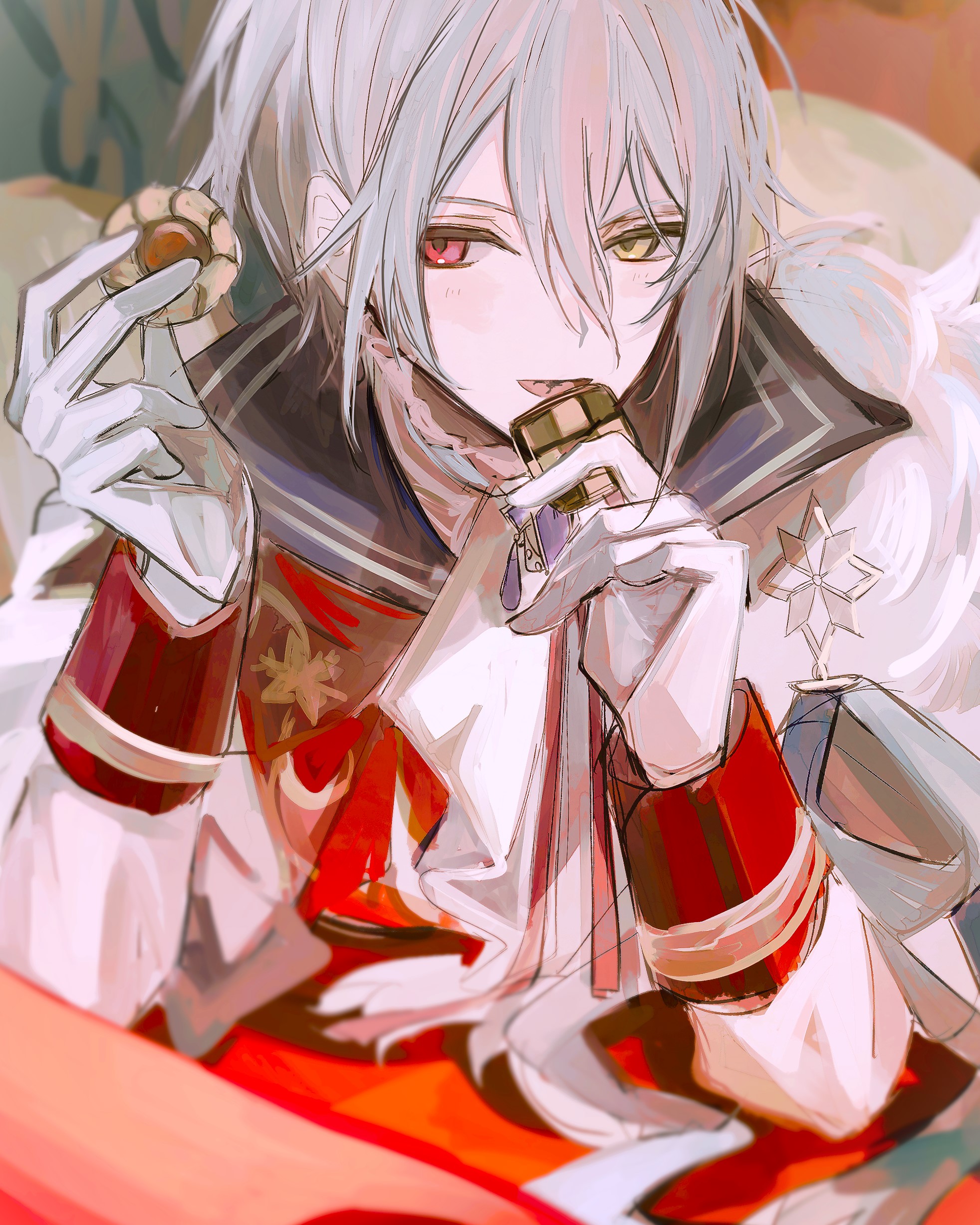 1boy absurdres chocolate food grey_hair heterochromia highres holding holding_food jacket mahoutsukai_no_yakusoku male_focus mg_omom multicolored_jacket open_mouth owen_(mahoutsukai_no_yakusoku) red_eyes red_jacket short_hair smile solo white_jacket yellow_eyes