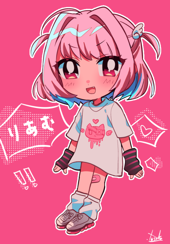 ! !! 1girl ahoge animal_print bandaid bandaid_on_knee bandaid_on_leg cat_print character_name chibi commentary fang fingerless_gloves full_body gloves hair_intakes hair_ornament heart heart_print idolmaster idolmaster_cinderella_girls leg_warmers looking_at_viewer medium_hair multicolored_hair no_pants open_mouth pink_background pink_hair print_shirt shirt signature simple_background smile solo thighs two-tone_hair two_side_up white_shirt wing_hair_ornament yumemi_riamu yuusuke-kun