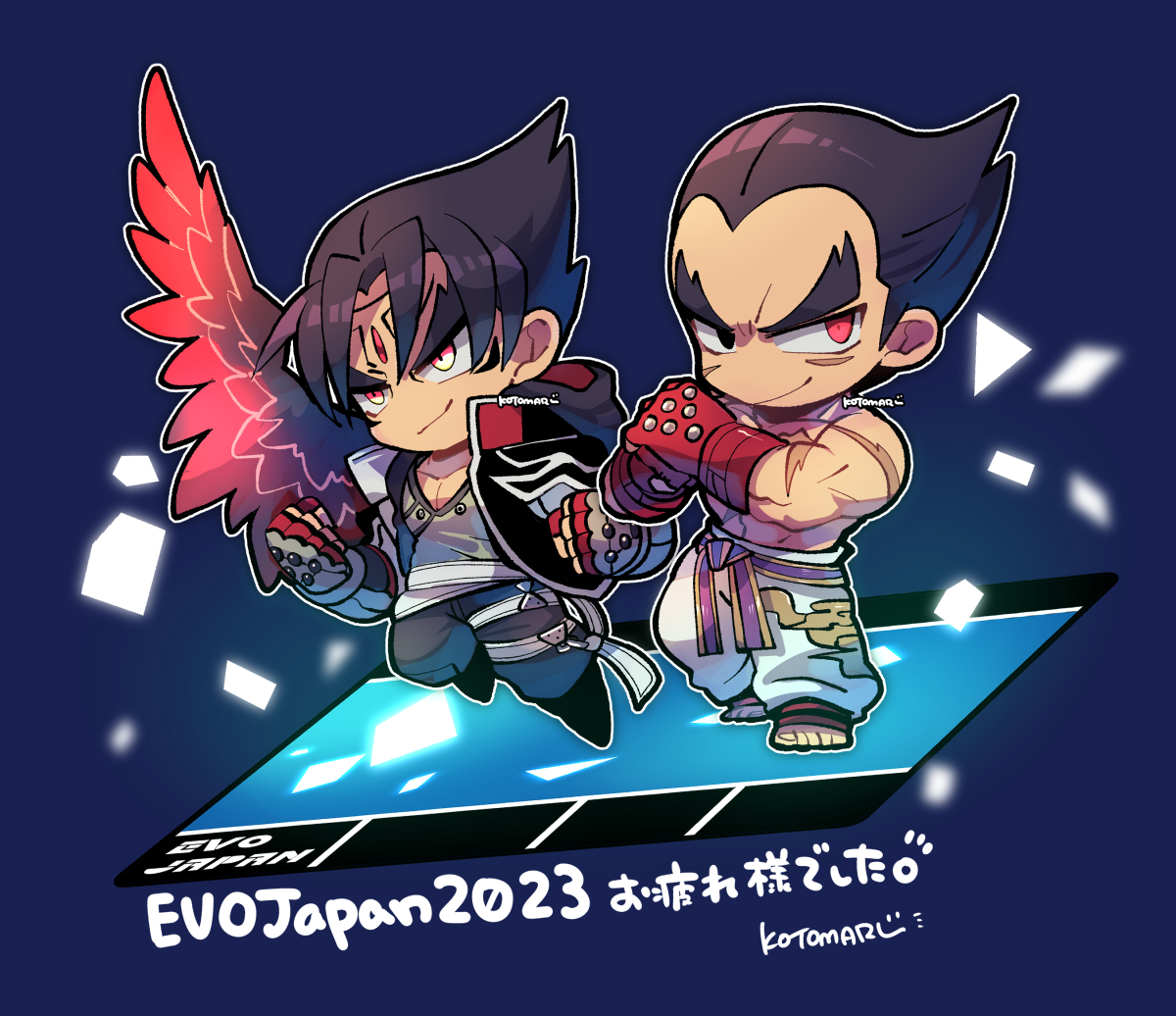 2023 2boys barefoot black_eyes black_footwear black_hair blue_background forehead_jewel gloves kazama_jin kotomaru_(kotokoto_kottan) male_focus mishima_kazuya multiple_boys orange_eyes pants red_eyes red_gloves red_wings scar scar_on_arm scar_on_chest scar_on_face single_wing smile studded_gloves tekken topless_male translation_request v-shaped_eyebrows white_pants wings