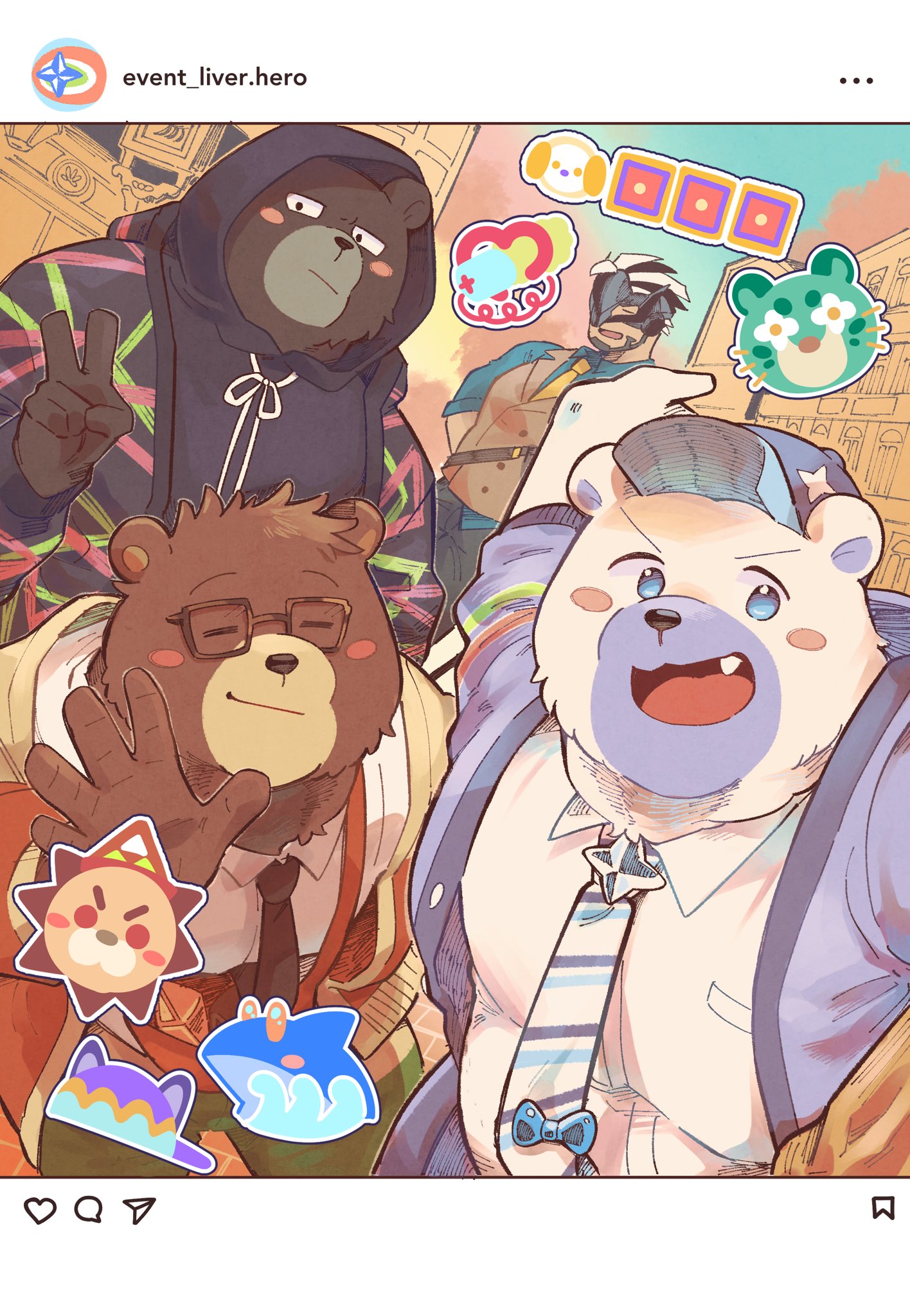 4boys animal_ears arm_up bara bear_boy bear_ears black_hoodie blue_fur blue_jacket blush_stickers brown_fur closed_mouth collared_shirt fang fat fat_man highres hood hood_up hoodie infernal_livestreamer_(housamo) instagram jacket looking_at_viewer male_focus mask multicolored_hair multiple_boys necktie open_hand open_mouth oscar_(housamo) pectorals rectangular_eyewear sawch_cls selfie shirt sticker tokyo_houkago_summoners two-tone_hair v valiant_livestreamer_(housamo) vest white_fur white_shirt world_livestreamer_(housamo)