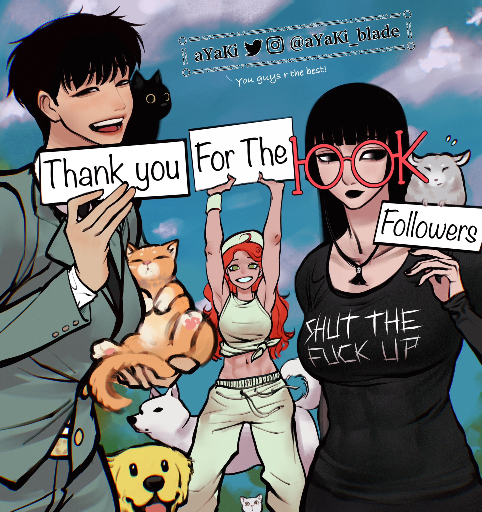 3girls abs animal animal_on_shoulder artist_name ayaki_blade black_eyes black_hair black_necktie blunt_bangs cat chinchilla_(animal) cloud commentary dog english_commentary english_text formal_clothes glasses green_eyes green_jacket green_suit hat highres holding holding_animal holding_sign jacket long_hair midriff mixed-language_commentary multiple_girls navel necktie open_mouth original red-haired_girl_(ayaki) red_hair shirt short_hair sign smile suit sylense_(ayaki) sylense_(ayaki_blade) thank_you tied_shirt tomoka_(ayaki) twitter_username watermark