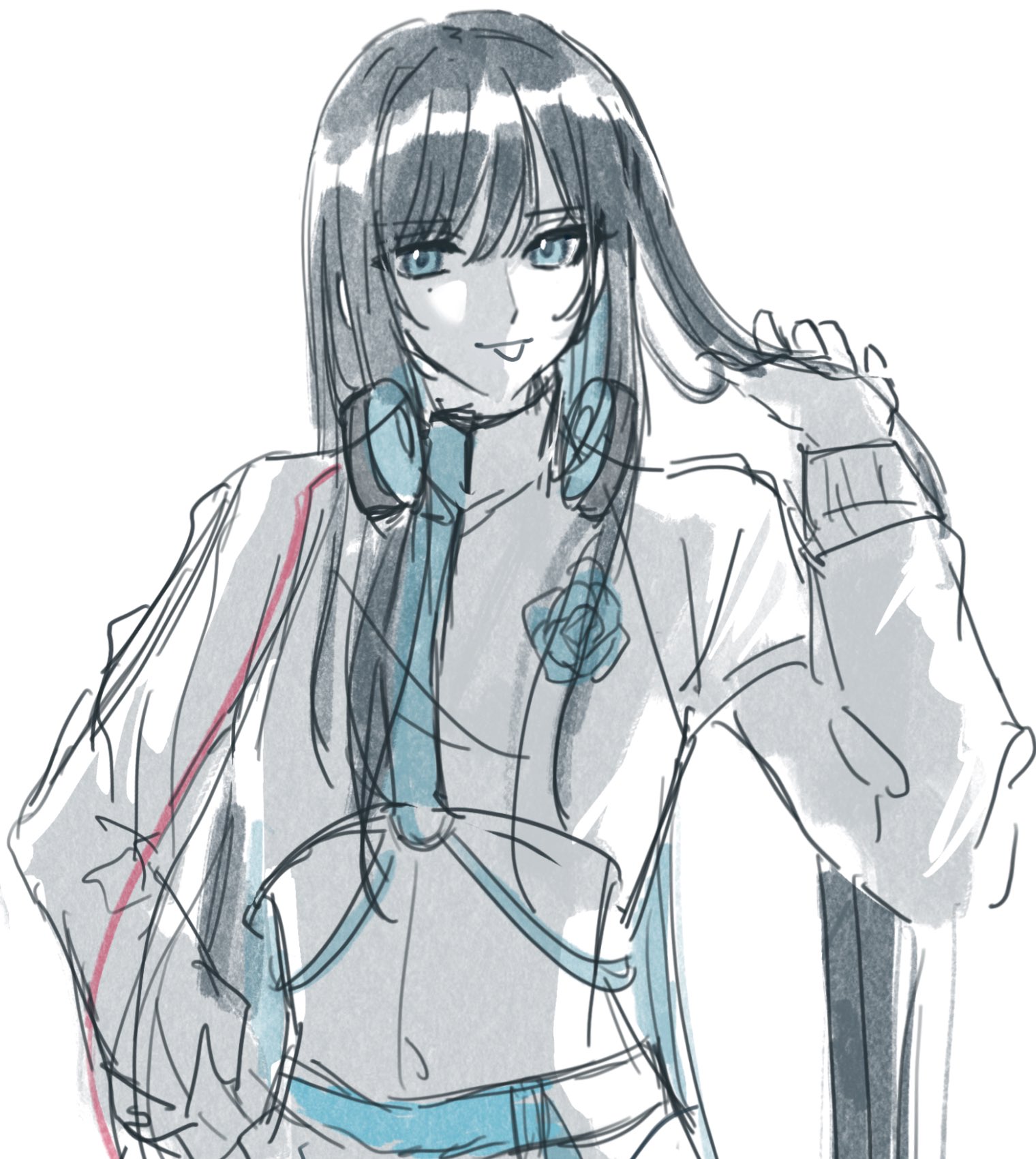 1girl ado_(utaite) black_hair blue_eyes blue_flower blue_hair blue_rose chando_(ado) cloud_nine_inc colored_inner_hair flower headphones headphones_around_neck highres long_hair long_sleeves looking_at_viewer mole mole_under_eye multicolored_hair partially_colored rose sidelocks simple_background sketch solo spica_(spica5f9ea0) tongue tongue_out upper_body utaite white_background