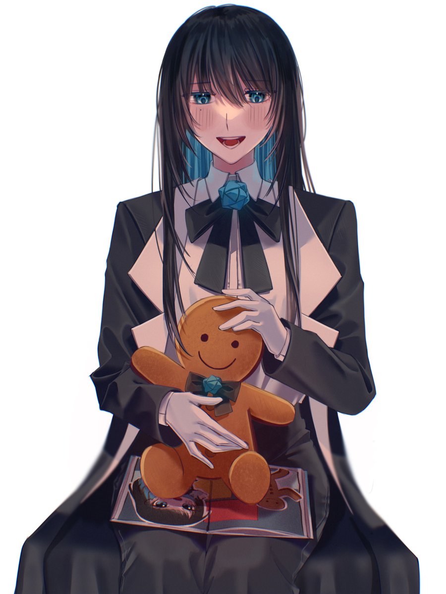 1girl ado_(utaite) black_bow black_bowtie black_coat black_hair blue_eyes blue_flower blue_hair blue_rose blush book bow bowtie brooch chando_(ado) cloud_nine_inc coat collared_shirt colored_inner_hair commentary dress_shirt flower flower_brooch gingerbread_man gloves hair_between_eyes highres long_hair long_sleeves mole mole_under_eye multicolored_hair open_book open_clothes open_coat open_mouth rose shirt sidelocks simple_background sitting solo spica_(spica5f9ea0) untranslatable_commentary teeth two-tone_hair utaite white_background white_gloves white_shirt
