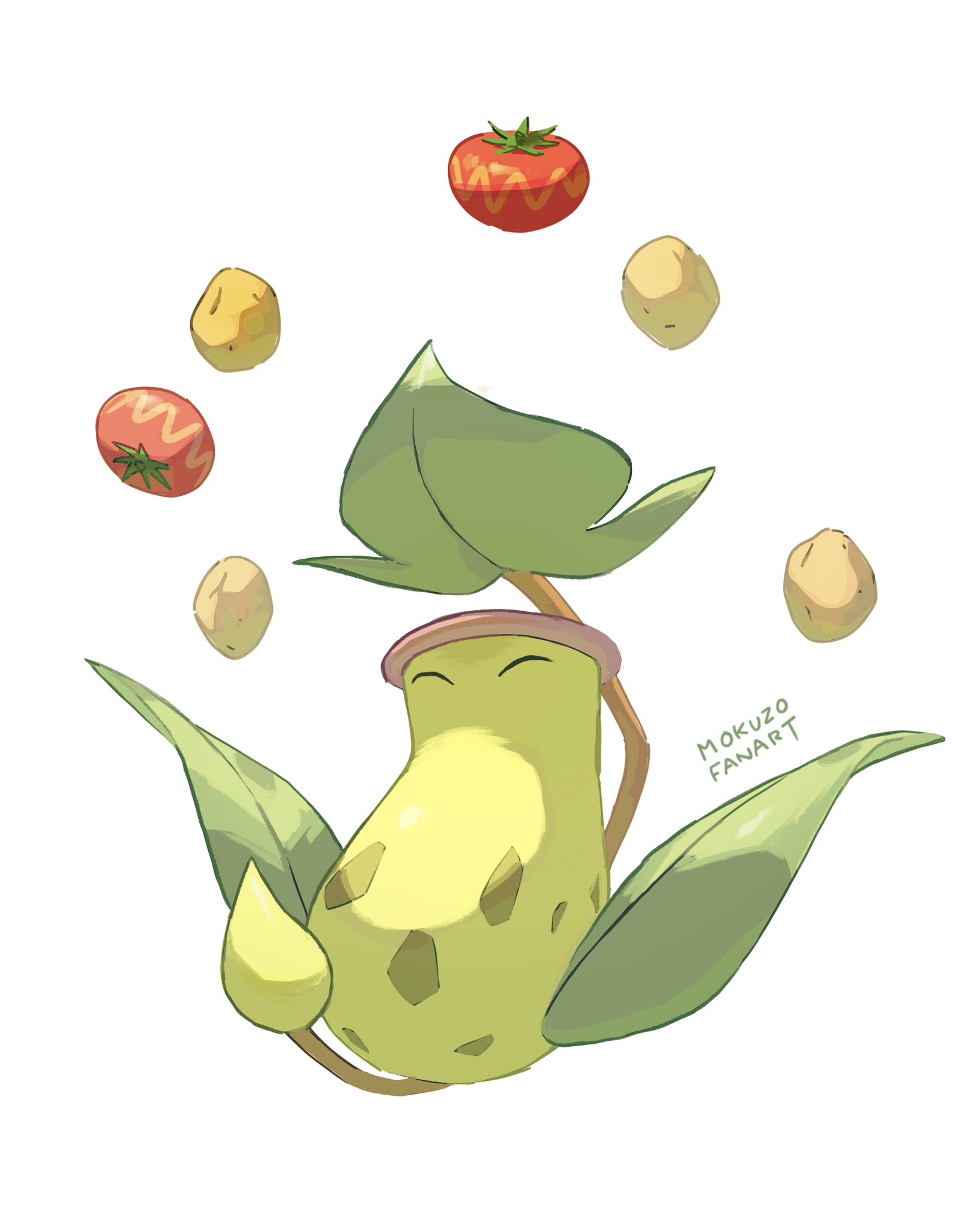^_^ closed_eyes food fruit full_body gen_1_pokemon highres mokuzou_(moku_ssbu) nintendo no_humans pitcher_plant plant pokemon pokemon_(creature) pokemon_focus signature solo tomato victreebel white_background