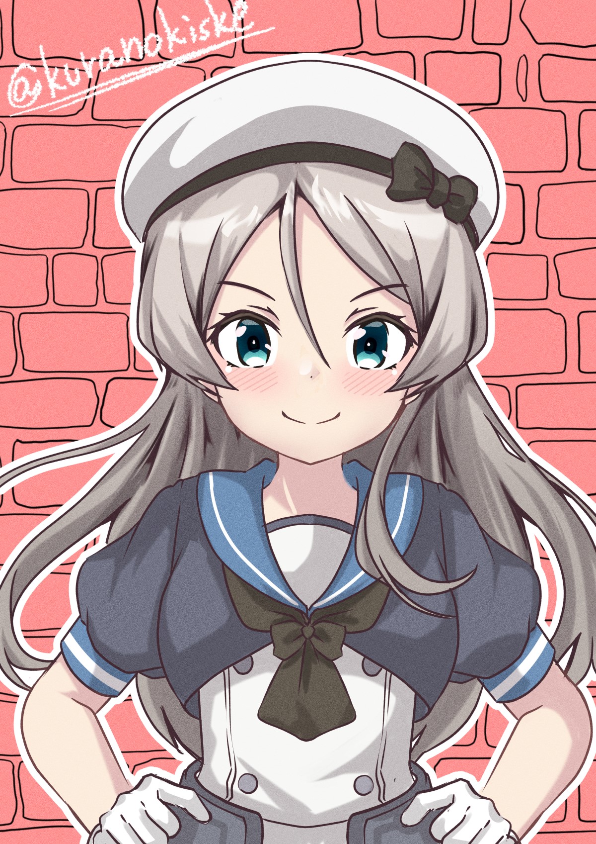 1girl black_jacket black_neckerchief blue_eyes blue_sailor_collar brick_wall dress gloves grey_hair hair_between_eyes hands_on_own_hips hat highres jacket javelin_(kancolle) kantai_collection kurano_kisuke long_hair looking_at_viewer loose_hair_strand neckerchief one-hour_drawing_challenge sailor_collar sailor_hat short_sleeves solo twitter_username white_dress white_gloves white_hat