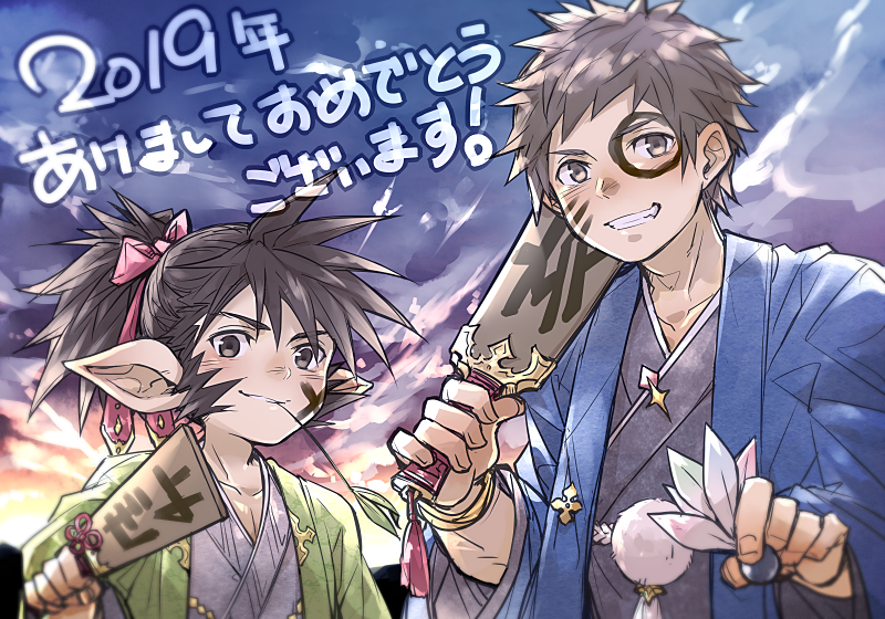 2019 2boys cloud cloudy_sky commentary_request dawn gran granblue_fantasy hagoita hane_(hanetsuki) hanetsuki happy_new_year ink_on_face japanese_clothes kimono looking_at_viewer male_focus mouth_hold multiple_boys new_year paddle ponytail sevilbarra sky smile stalk_in_mouth utakatauta_(takopa)