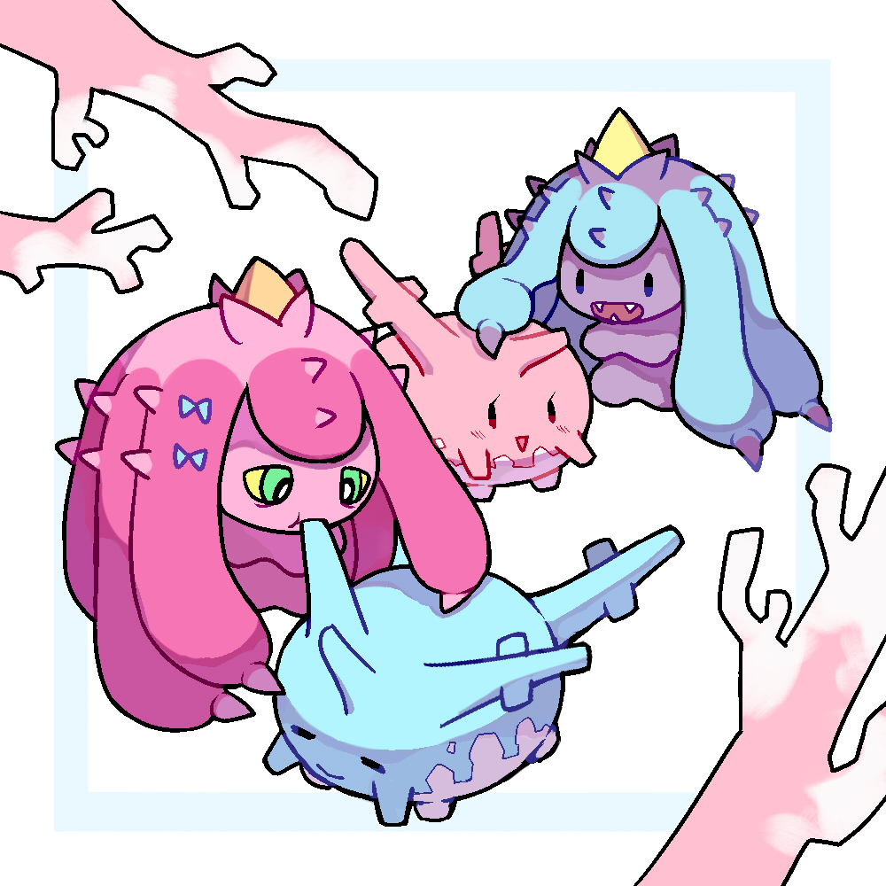 :d alternate_color blush bright_pupils colored_sclera commentary_request coral corsola dian_(nanooo_i) gen_2_pokemon gen_7_pokemon green_eyes mareanie nibbling nintendo no_humans open_mouth pokemon pokemon_(creature) shiny_and_normal shiny_pokemon smile white_pupils yellow_sclera