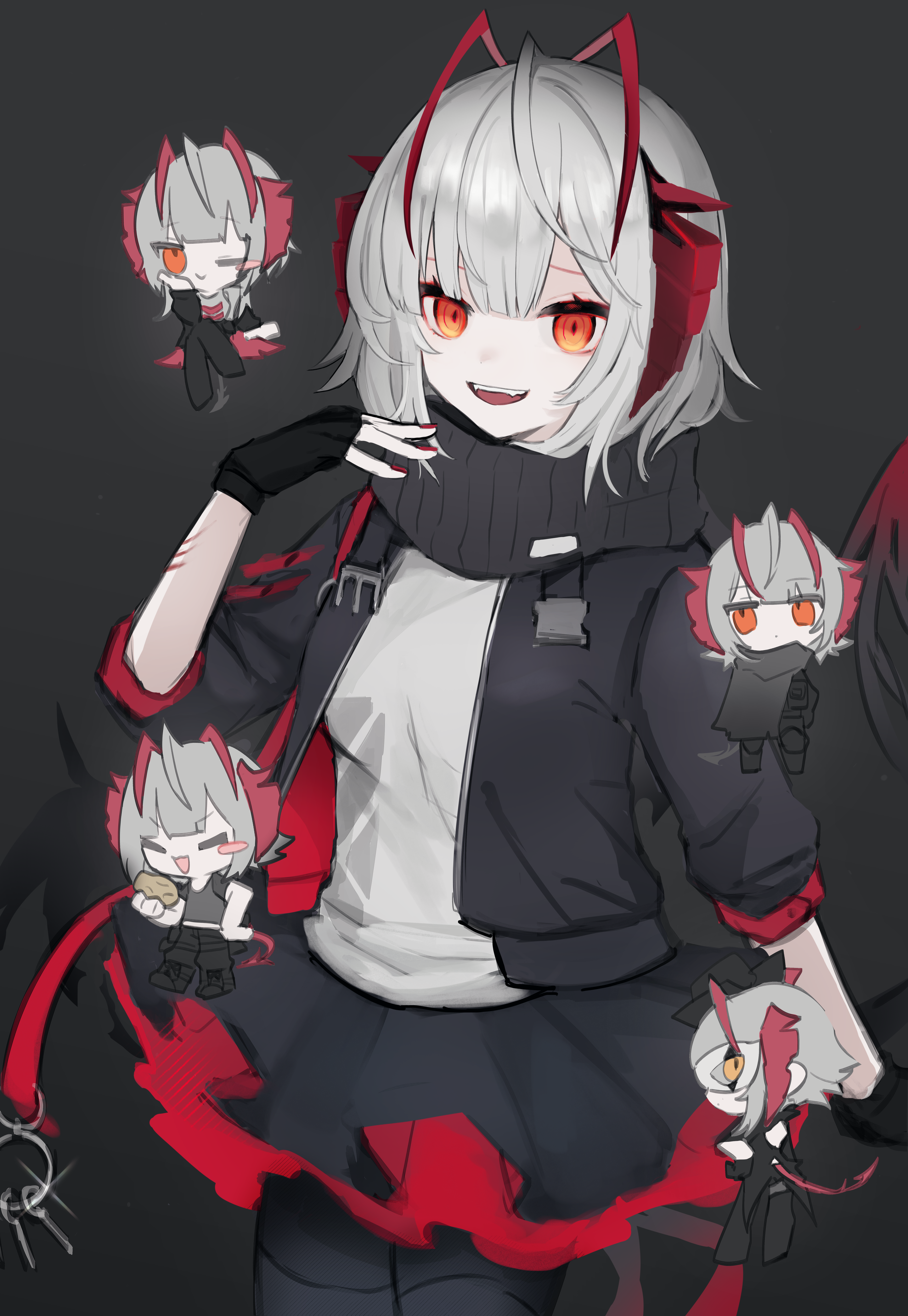 1girl 3rd_rb absurdres ahoge ambience_synesthesia antenna_hair arknights black_gloves black_jacket black_pantyhose black_scarf black_skirt black_tail breasts buckle chibi chibi_inset commentary_request cowboy_shot demon_girl demon_horns demon_tail dot_nose dyed_ahoge eyelashes eyeliner fangs fingerless_gloves fingernails glint gloves gradient_background grey_background grey_hair hair_between_eyes hand_up happy highres horns jacket layered_clothes layered_skirt legs_together long_sleeves looking_at_viewer makeup medium_breasts miniskirt multicolored_skirt multiple_scars nail_polish o-ring o-ring_strap official_alternate_costume open_clothes open_jacket open_mouth orange_eyes pantyhose pleated_skirt red_eyeliner red_horns red_nails red_skirt ringed_eyes scar scar_on_arm scarf shadow shirt short_hair skirt slit_pupils smile snap-fit_buckle solo standing strap striped_clothes striped_scarf tail teeth tongue torn_clothes torn_scarf two-sided_fabric two-sided_jacket two-tone_skirt upper_teeth_only variant_set vertical-striped_clothes vertical-striped_scarf w_(arknights) w_(fugue)_(arknights) w_(wanted)_(arknights) white_shirt