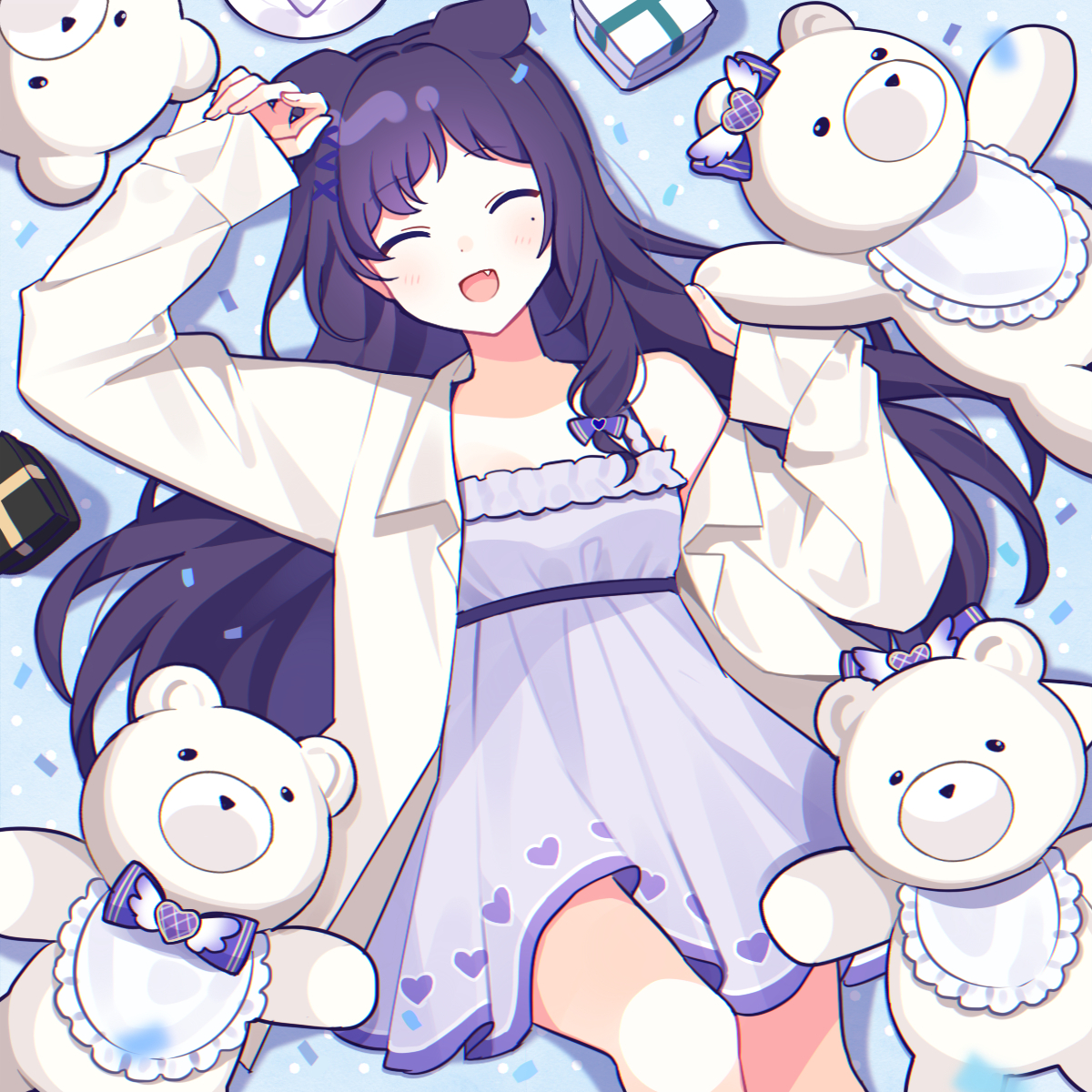 1girl aiba_uiha aiba_uiha_(3rd_costume) blue_background blue_bow bow breasts closed_eyes confetti dress feet_out_of_frame gift hair_bow heart highres jacket long_hair lying medium_breasts nijisanji off_shoulder on_back open_mouth purple_dress purple_hair simple_background smile solo stuffed_animal stuffed_toy teddy_bear virtual_youtuber waka_(wk4444) white_jacket