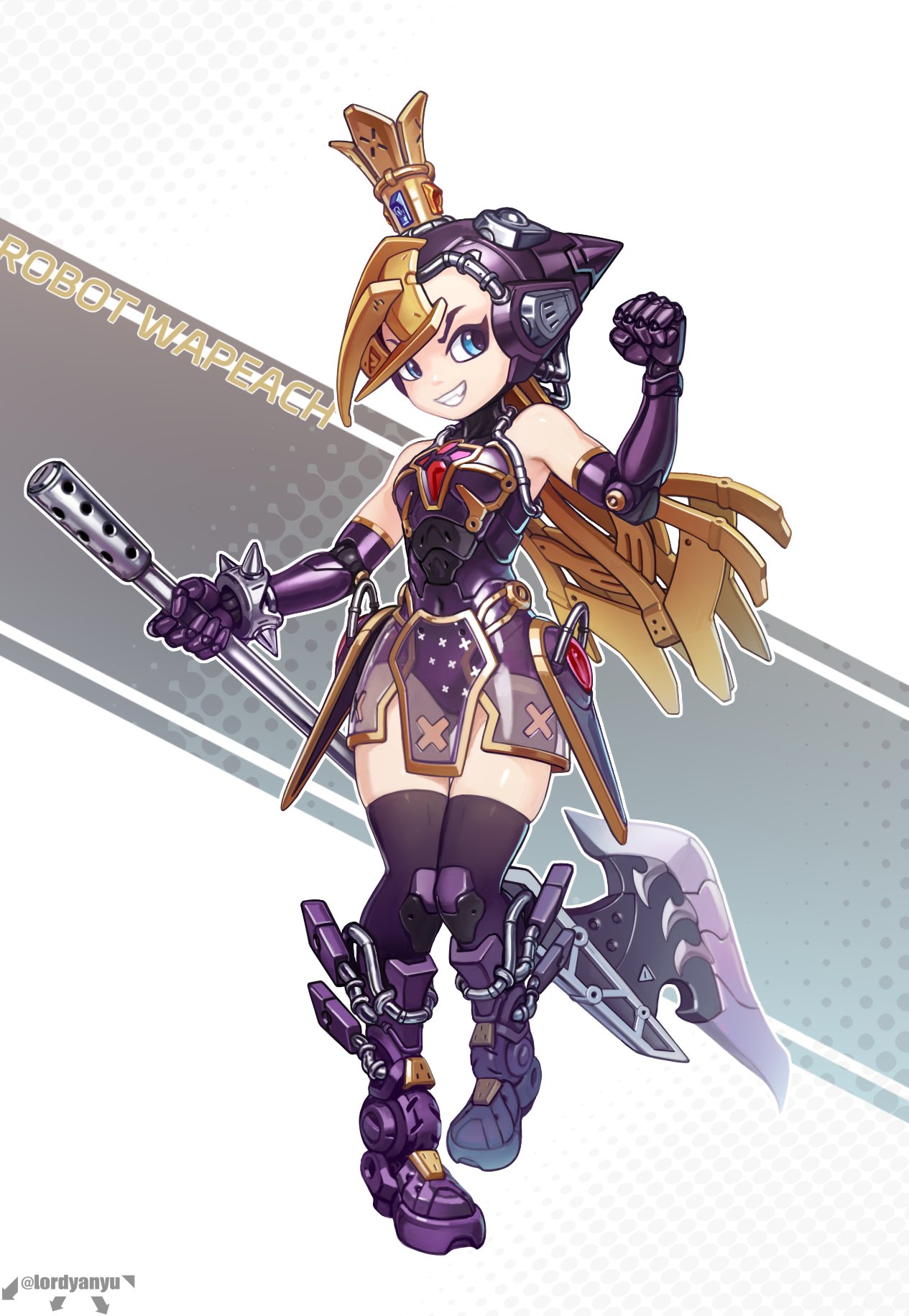 1girl adapted_costume axe bare_shoulders blonde_hair blue_eyes bracelet crown elbow_gloves full_body gloves grin highres holding holding_axe jewelry lordyanyu mario_(series) mario_power_tennis mario_tennis mechanical_hair nintendo pigeon-toed reverse_grip see-through_clothes smile solo spiked_bracelet spikes thighhighs warupeach
