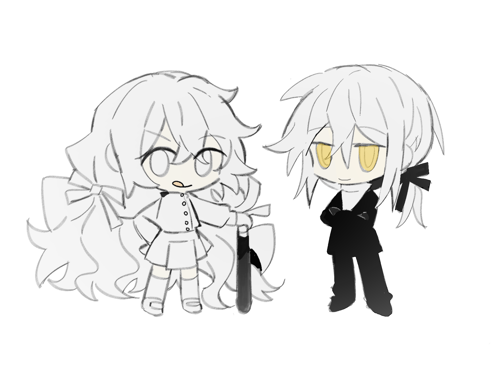 1boy 1girl :d black_bow black_footwear black_gloves black_jacket black_pants black_sleeves bow buttons charles_eyler charlotte_wiltshire chibi chinese_commentary closed_mouth commentary_request crossed_arms gloves hair_bow hand_on_own_hip hello_charlotte highres holding jacket kneehighs long_hair long_sleeves looking_at_viewer low_ponytail mary_janes miniskirt object_request open_mouth pants pleated_skirt ponytail puffy_long_sleeves puffy_sleeves shirt shoes short_ponytail simple_background skirt smile socks tiankong_yiji tongue tongue_out turtleneck very_long_hair white_background white_bow white_eyes white_footwear white_gloves white_hair white_shirt white_skirt white_sleeves white_socks yellow_eyes