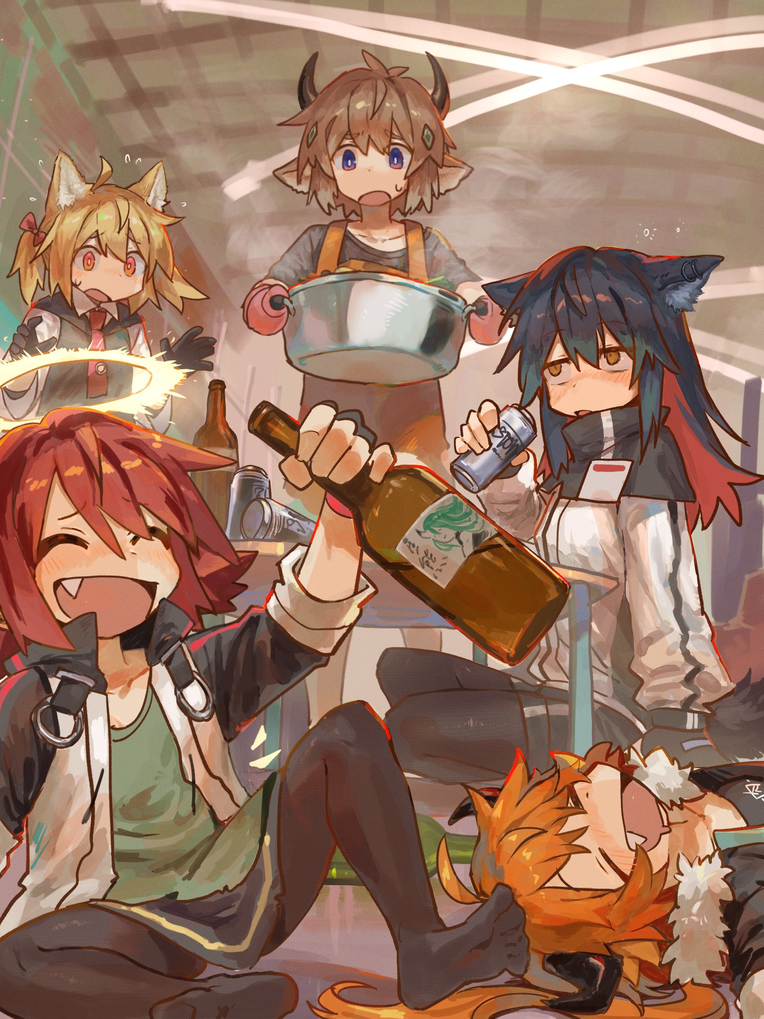 1boy 4girls alcohol animal_ear_fluff animal_ears apron arknights beer_can bison_(arknights) black_capelet black_hair black_pantyhose black_shorts blonde_hair bottle brown_hair can capelet cooking_pot cow_boy cow_ears croissant_(arknights) drink_can drunk exusiai_(arknights) fang fur_trim gloves green_shirt halo highres holding holding_bottle holding_cooking_pot hoshiguma_(arknights) indoors jacket multicolored_hair multiple_girls mutomorokoshi name_tag necktie open_clothes open_jacket orange_apron orange_hair pantyhose pantyhose_under_shorts party penguin_logistics_(arknights) red_hair red_necktie shirt short_hair shorts skirt sleeves_rolled_up sora_(arknights) texas_(arknights) twintails white_jacket wolf_ears wolf_girl worried yellow_halo