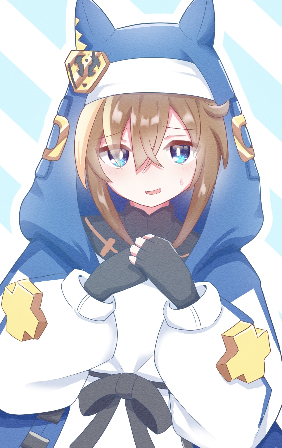 1girl 2nisikoyn animal_ears aqua_eyes black_bow black_gloves blue_background blush bow bridget_(guilty_gear) bridget_(guilty_gear)_(cosplay) brown_hair cheval_grand_(umamusume) commentary_request cosplay fingerless_gloves genderswap gloves guilty_gear guilty_gear_strive habit hair_between_eyes highres hood hood_up hooded_jacket hoodie horse_ears jacket light_brown_hair long_sleeves looking_at_viewer medium_hair multicolored_hair nervous_smile open_clothes open_hoodie open_mouth puffy_long_sleeves puffy_sleeves simple_background smile solo streaked_hair striped_background sweatdrop umamusume upper_body white_background white_hair