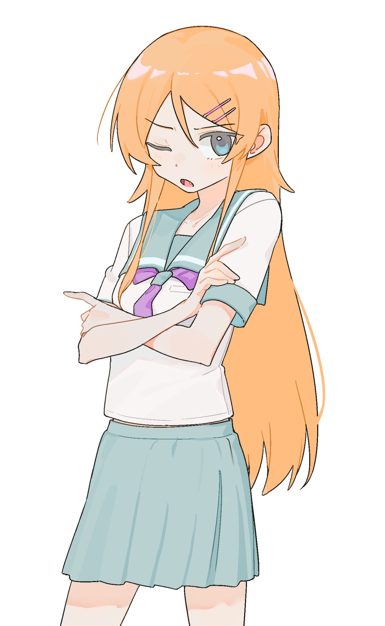1girl aqua_eyes crossed_arms fang green_sailor_collar green_skirt hair_between_eyes hair_ornament hairclip highres kousaka_kirino kurobeko_(kur0bek0) long_hair looking_at_viewer midriff_peek neckerchief one_eye_closed open_mouth orange_hair ore_no_imouto_ga_konna_ni_kawaii_wake_ga_nai pink_neckerchief pleated_skirt sailor_collar school_uniform serafuku shirt short_sleeves simple_background skirt solo white_background