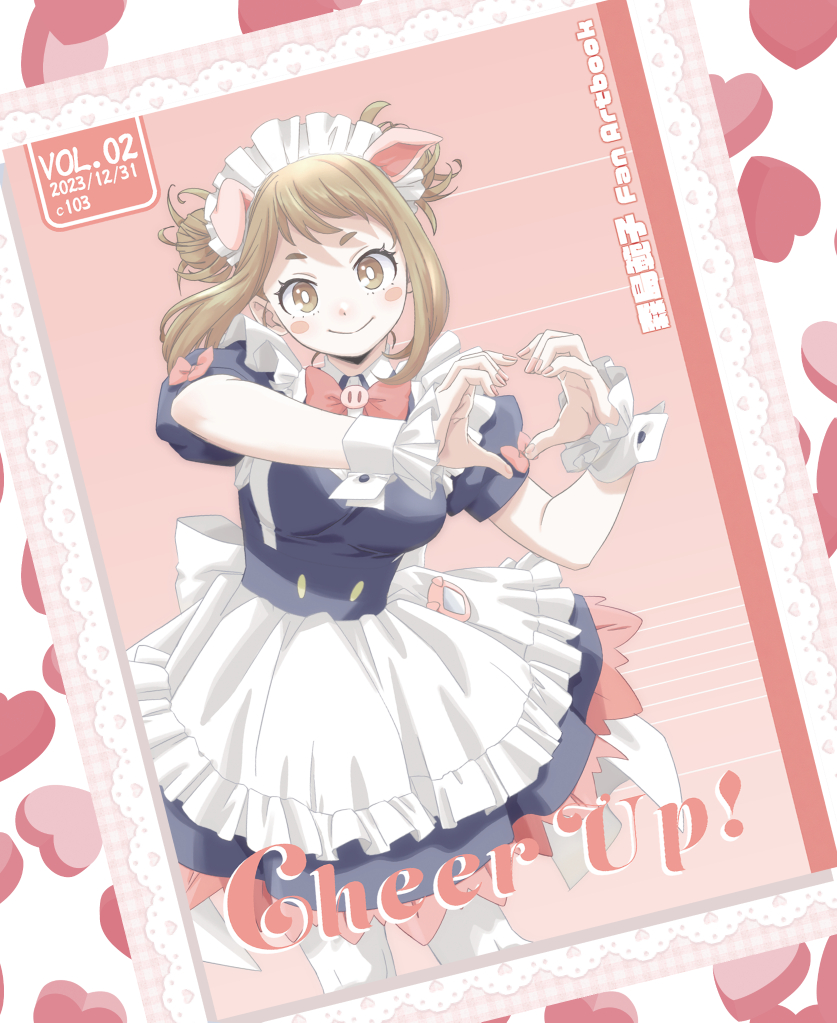 alternate_costume alternate_hairstyle animal_ears apron black_dress blush_stickers boku_no_hero_academia bow brown_eyes brown_hair closed_mouth comiket comiket_103 cover cover_page double_bun dress enmaided fake_animal_ears hair_bun heart heart_hands looking_at_viewer maid maid_headdress messy_hair morishima_noriko pig_ears pink_bow smile uraraka_ochako waist_apron white_apron