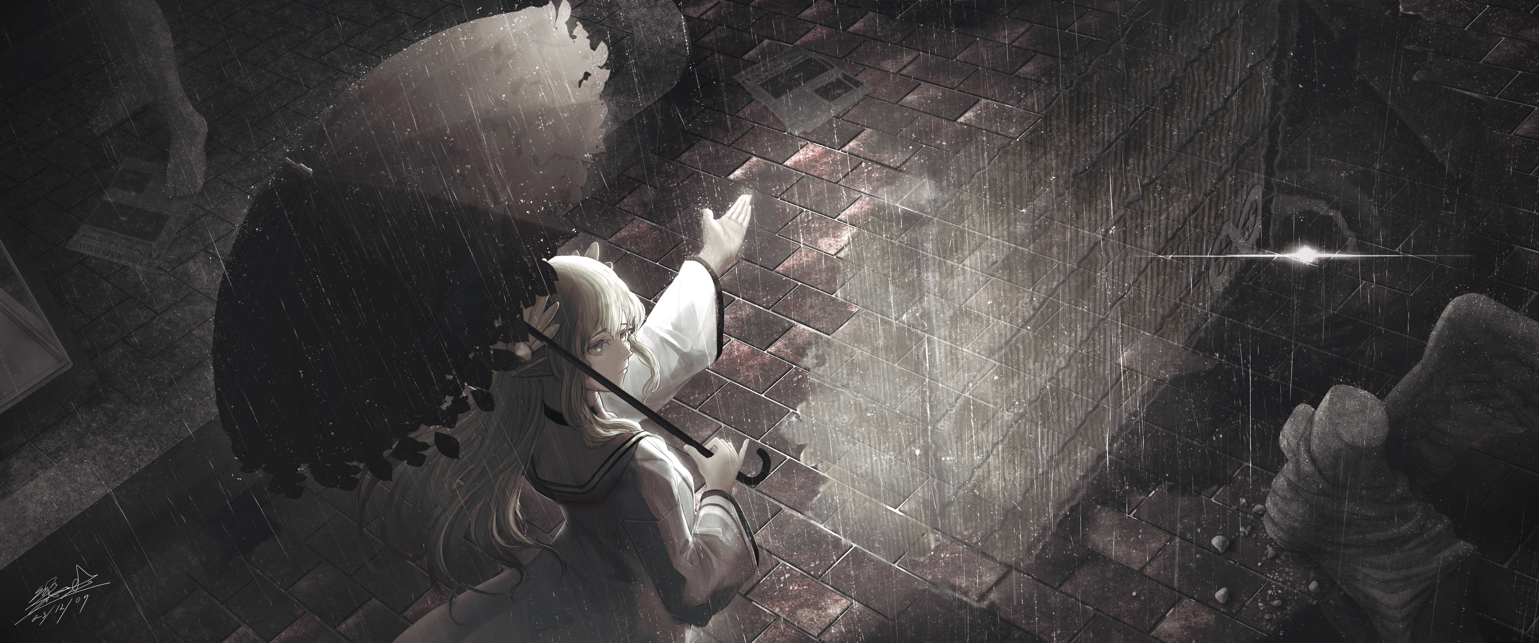 1girl absurdres arknights brick_road coat dated highres holding holding_umbrella jgh0552 laurels long_hair long_sleeves looking_at_viewer mole mole_under_eye muelsyse_(arknights) muted_color newspaper open_hand outdoors pointy_ears puddle rain signature solo statue umbrella very_long_hair white_coat yellow_eyes