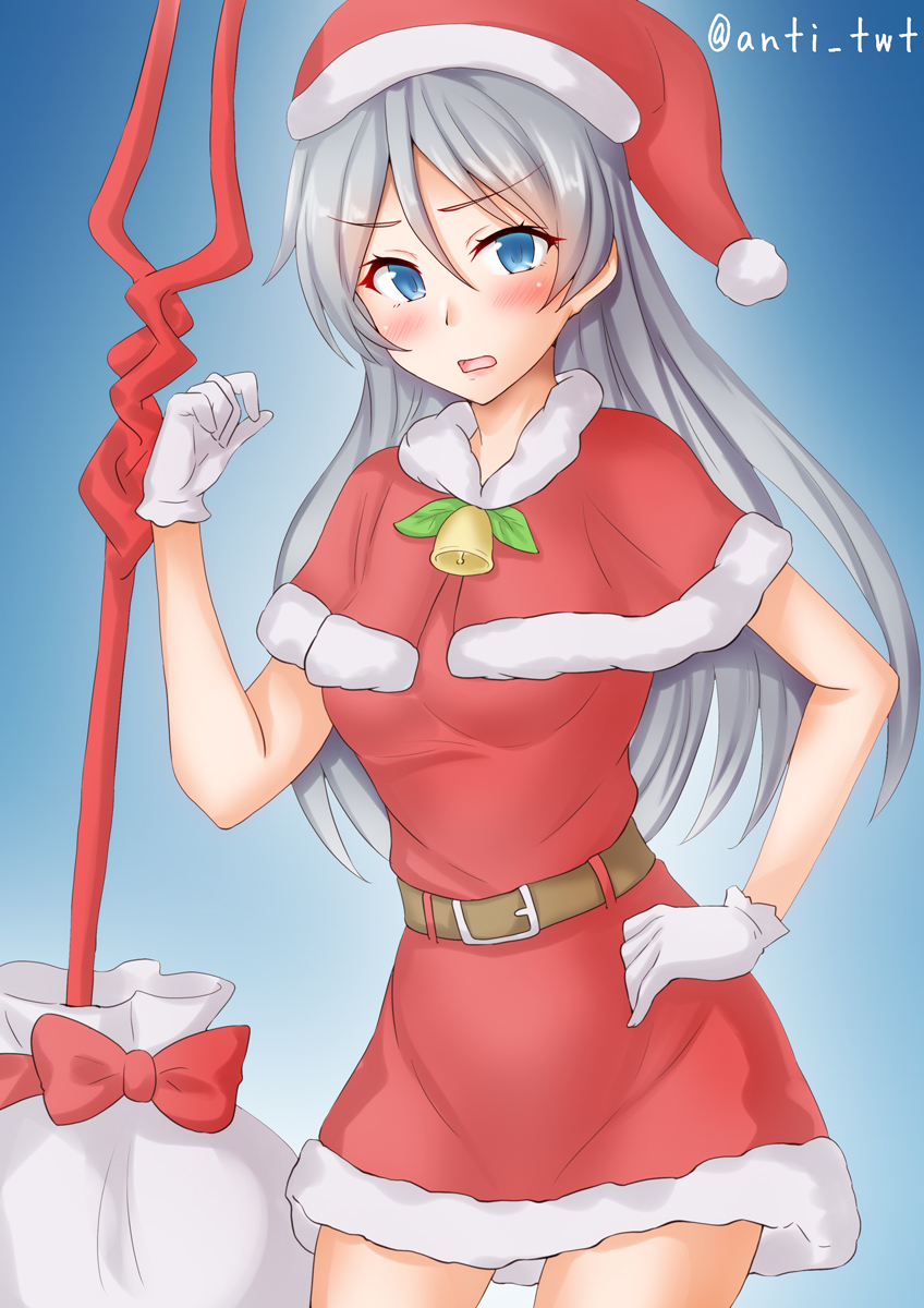 1girl anti_(untea9) belt blue_background blue_eyes blush breasts capelet christmas dress fur-trimmed_capelet fur-trimmed_dress fur-trimmed_headwear fur_trim gloves gradient_background grey_hair hat highres javelin_(kancolle) kantai_collection lance_of_longinus_(evangelion) long_hair looking_at_viewer medium_breasts merry_christmas red_capelet red_dress red_hat sack santa_costume santa_dress santa_hat short_dress smile solo twitter_username white_gloves
