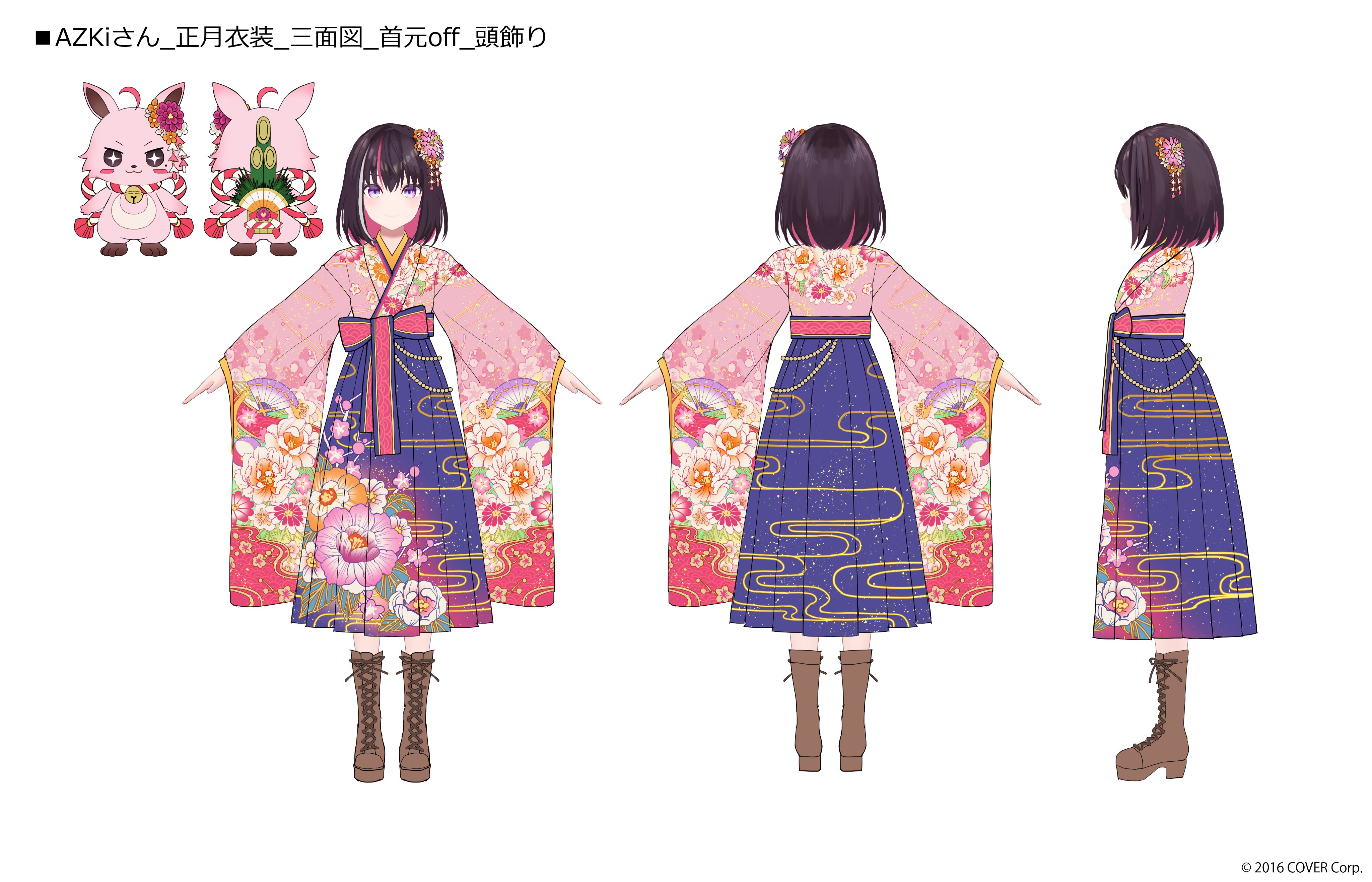 1girl 3d absurdres artist_request azki_(hololive) azki_(new_year)_(hololive) black_footwear blue_hakama blue_skirt bob_cut boots brown_hair closed_mouth colored_inner_hair copyright_notice floral_print floral_print_kimono flower hair_flower hair_ornament hakama hakama_skirt highres hololive japanese_clothes kanzashi kimono lace-up_boots light_blush long_skirt medium_hair multicolored_hair multiple_views official_alternate_costume official_art pink_hair pink_kimono pioneer_(azki) pleated_skirt print_kimono reference_sheet simple_background skirt smile streaked_hair t-pose tsumami_kanzashi turnaround virtual_youtuber white_background white_hair